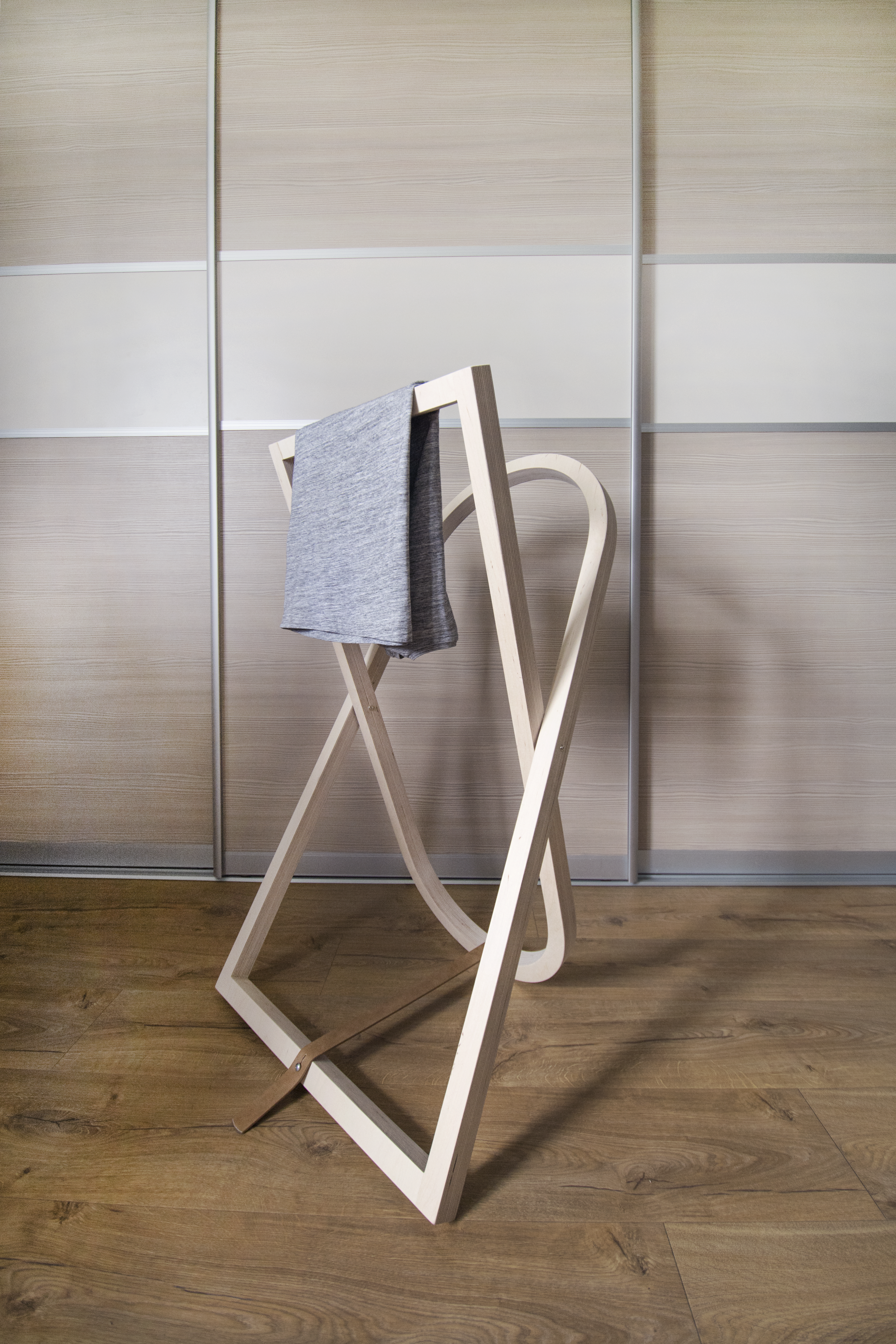 Řešení vychází z geometrie a skládá se ze dvou tvarově stejných kusů, které do sebe zapadají. U rozložení jsem použila kožený pásek, který podporuje stabilitu sluhy. Nábytek je snadno složitelný.