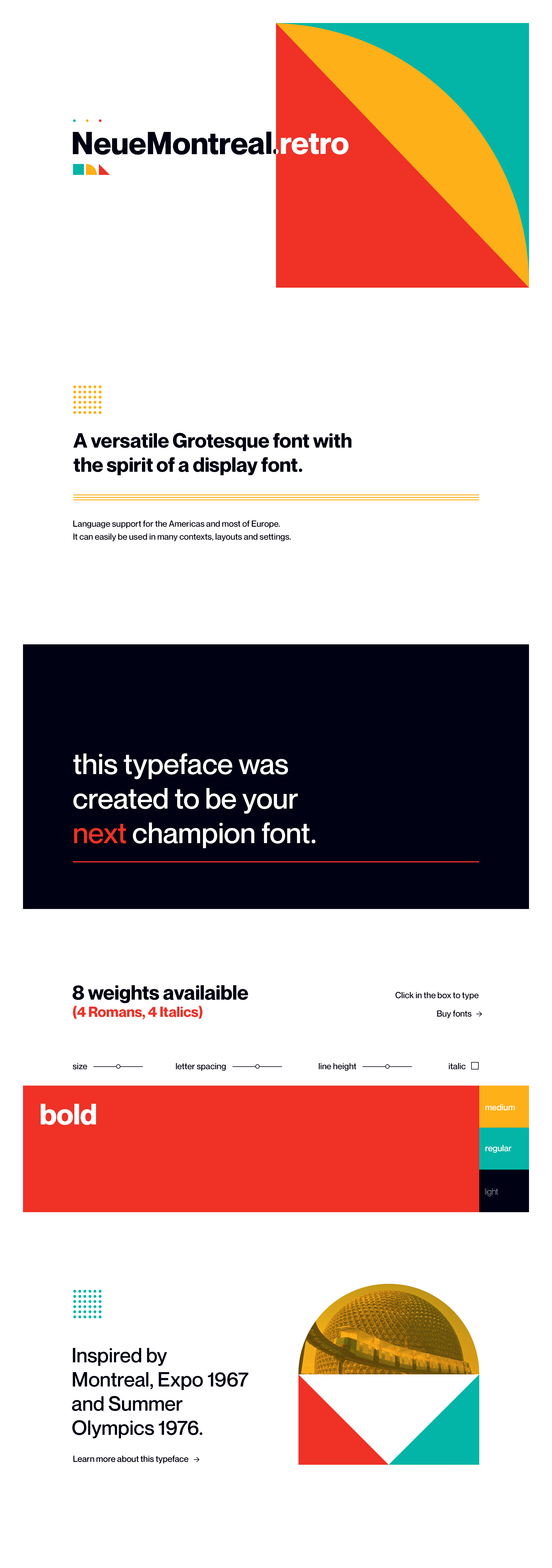 Vytvořil jsem jednoduchou microsite pro písmo Neue Montreal, k písmu švýcarského stylu jsem se snažil vytvořit identitu pomocí jednoduchých tvarů a přesné barevné palety. Při vstupu do microsite, je animace, s pro mne klíčovými slovy pro tohle písmo a "morphing" tvarů jako podpora hravosti