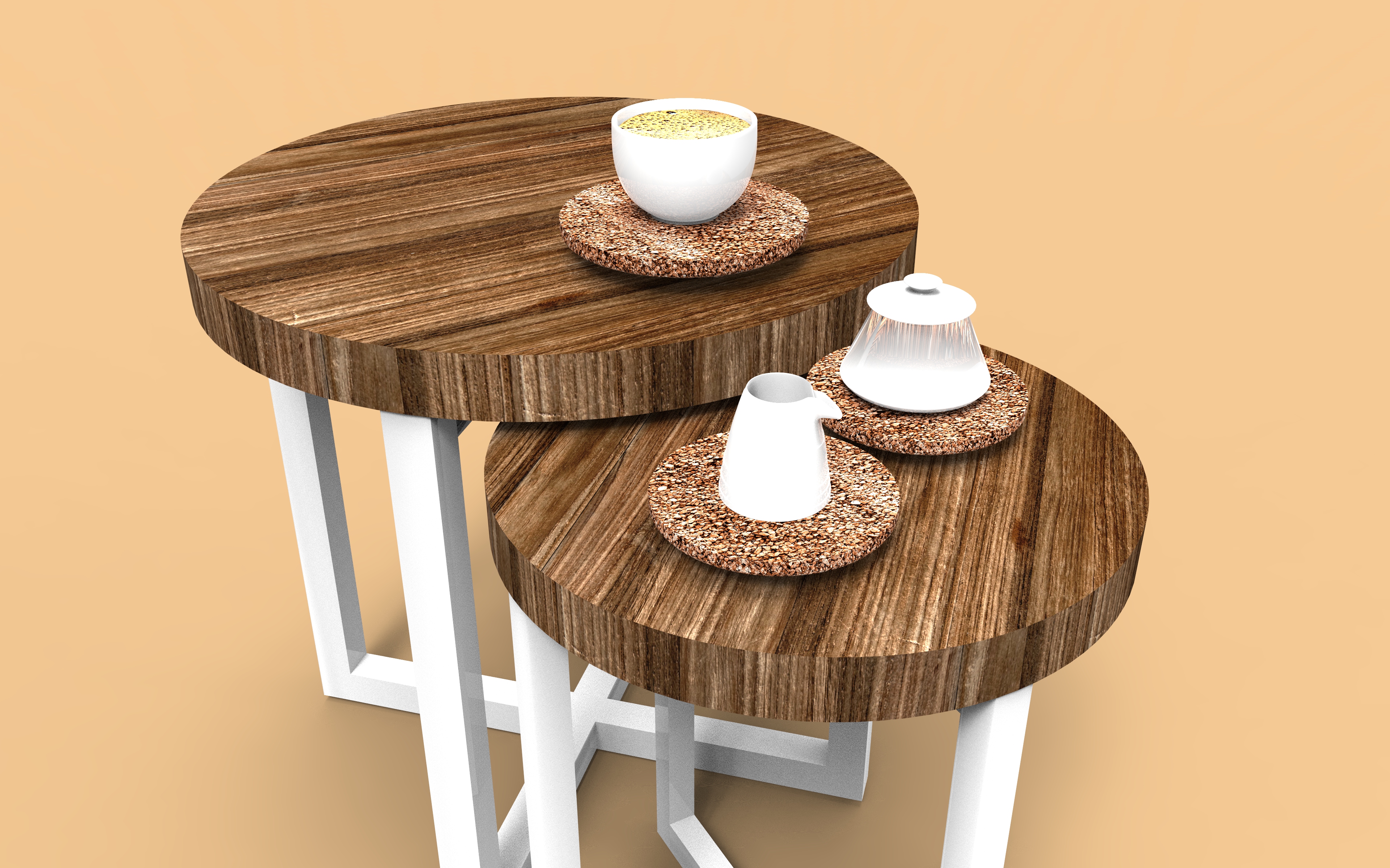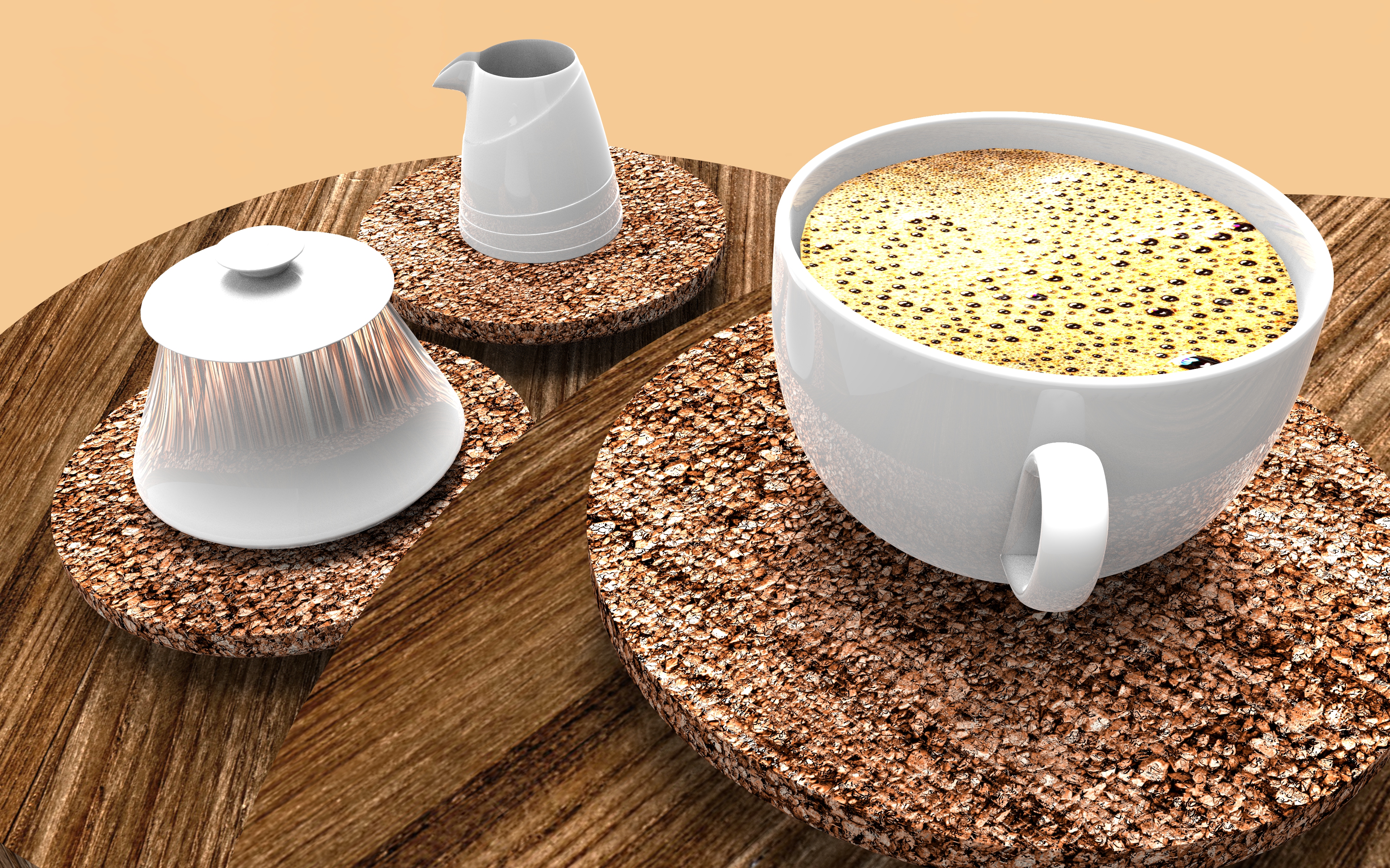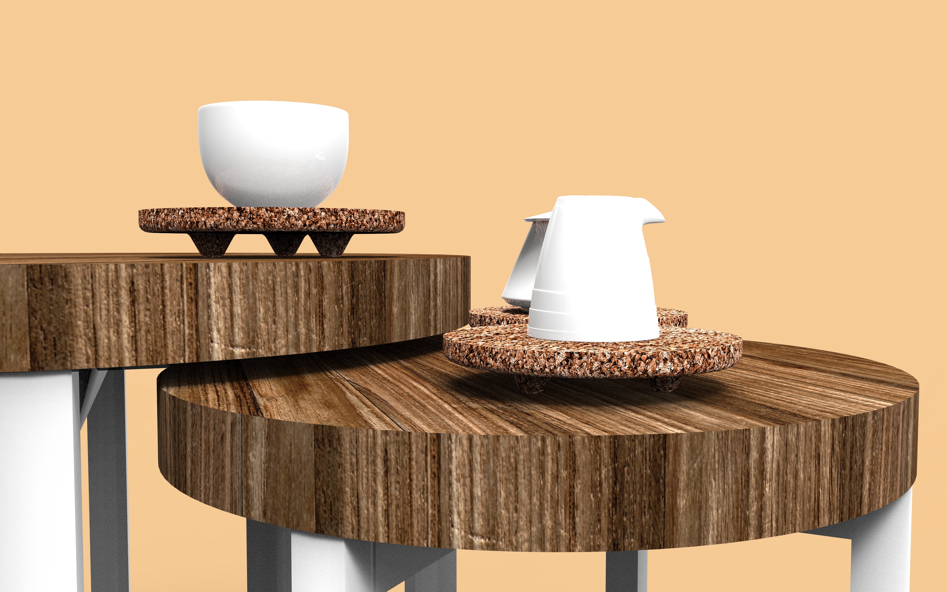Materiál vytvořený ze skořápek vlašských ořechů a přírodního lepidla. Z něj je vytvořena sada ke kávě.