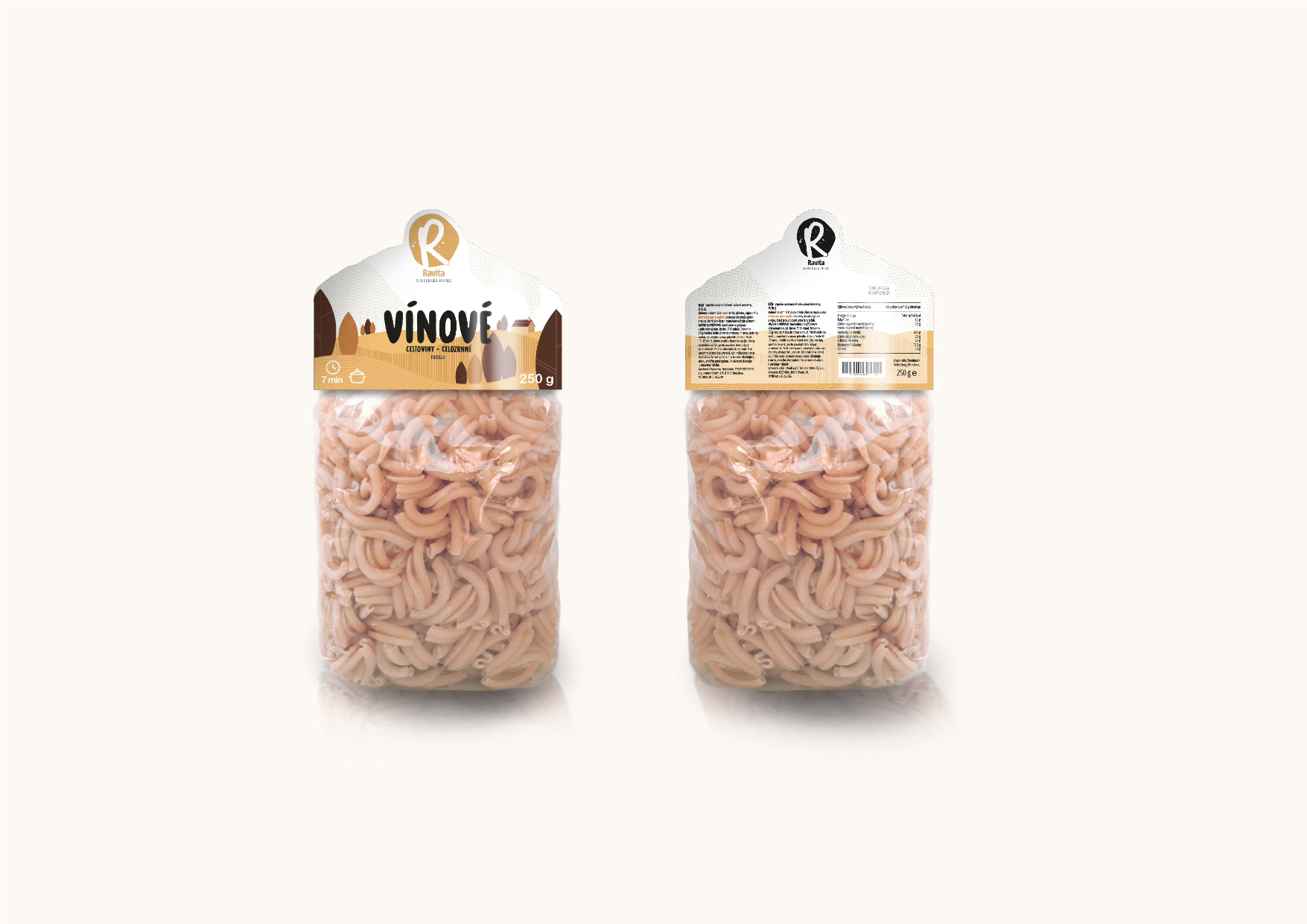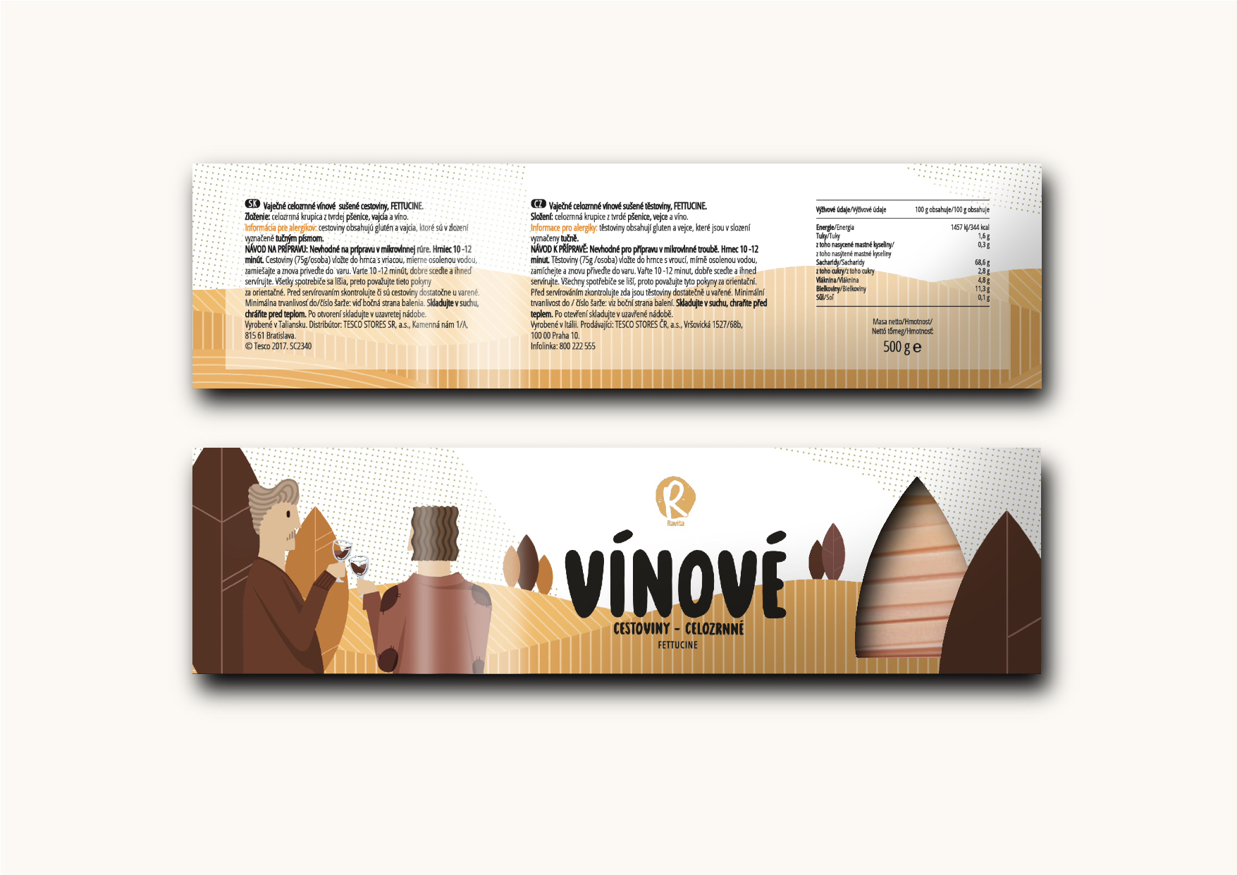 grafike zobrazujem polia s domom, ktorému stúpa dym z komína, táto grafika je určená pre cestovín fusilli. Druhá grafika je určená pre fettuciny. Na tejto grafike zobrazujem polia s dvoma pánmi pijúcimi červené víno, ktoré je hlavnou ingredienciou tejto sériie cestovín.