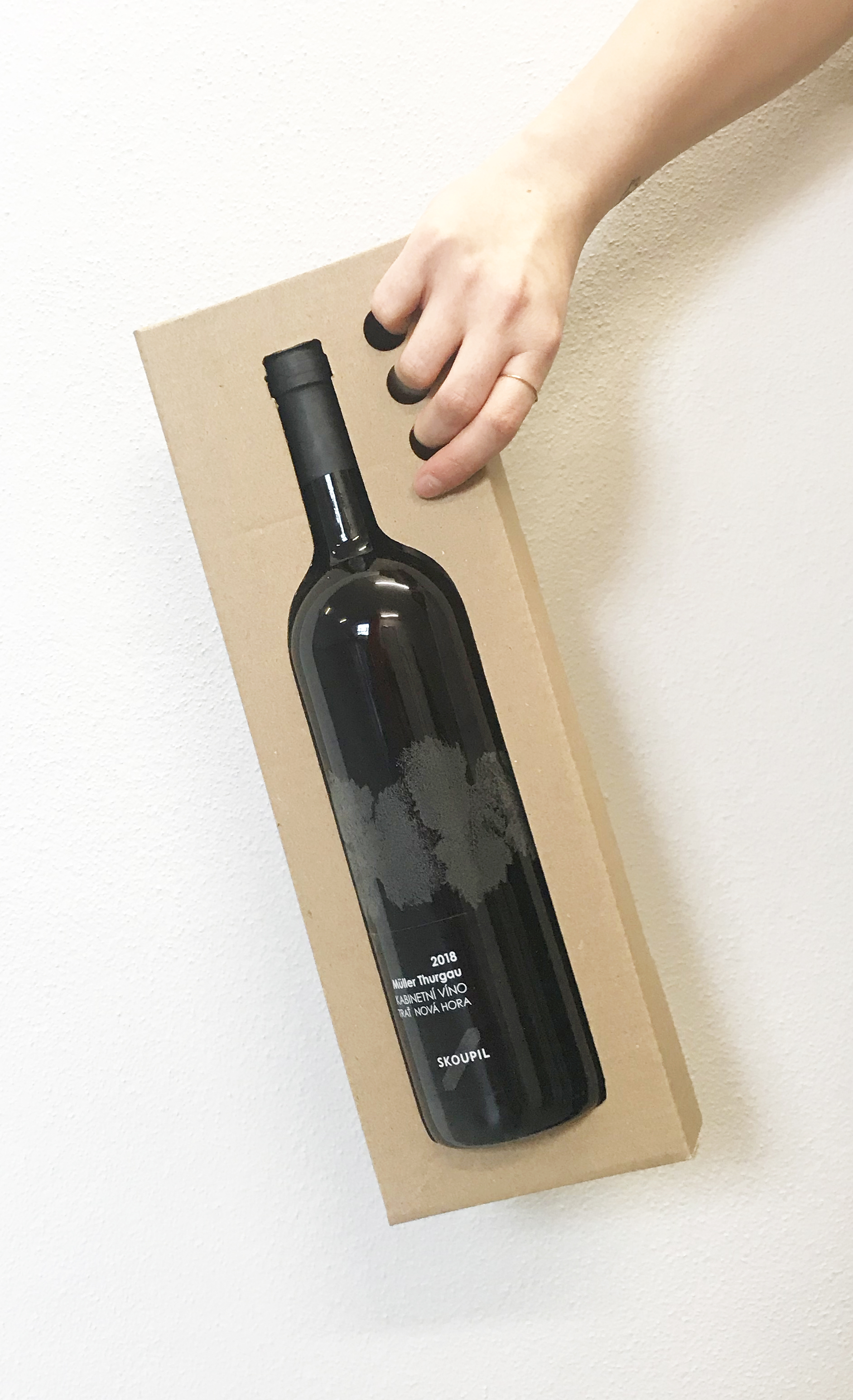 Jednoduchý, minimalistický dizajn obalu na víno skladá sa z jednej časti lepenky, bez lepenia. Úchyt obalu je vtipne vyriešení troma otvormi na prsty.