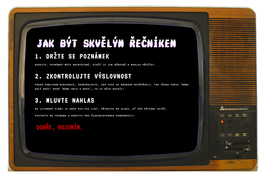 Rekonstrukce revoluční atmosféry listopadu 1989, poklona tehdejším řečníkům jako nepostradatelným článkům budování tehdejší demokratické společnosti. Cílem je postavit uživatele do role řečníka na letenské pláni.