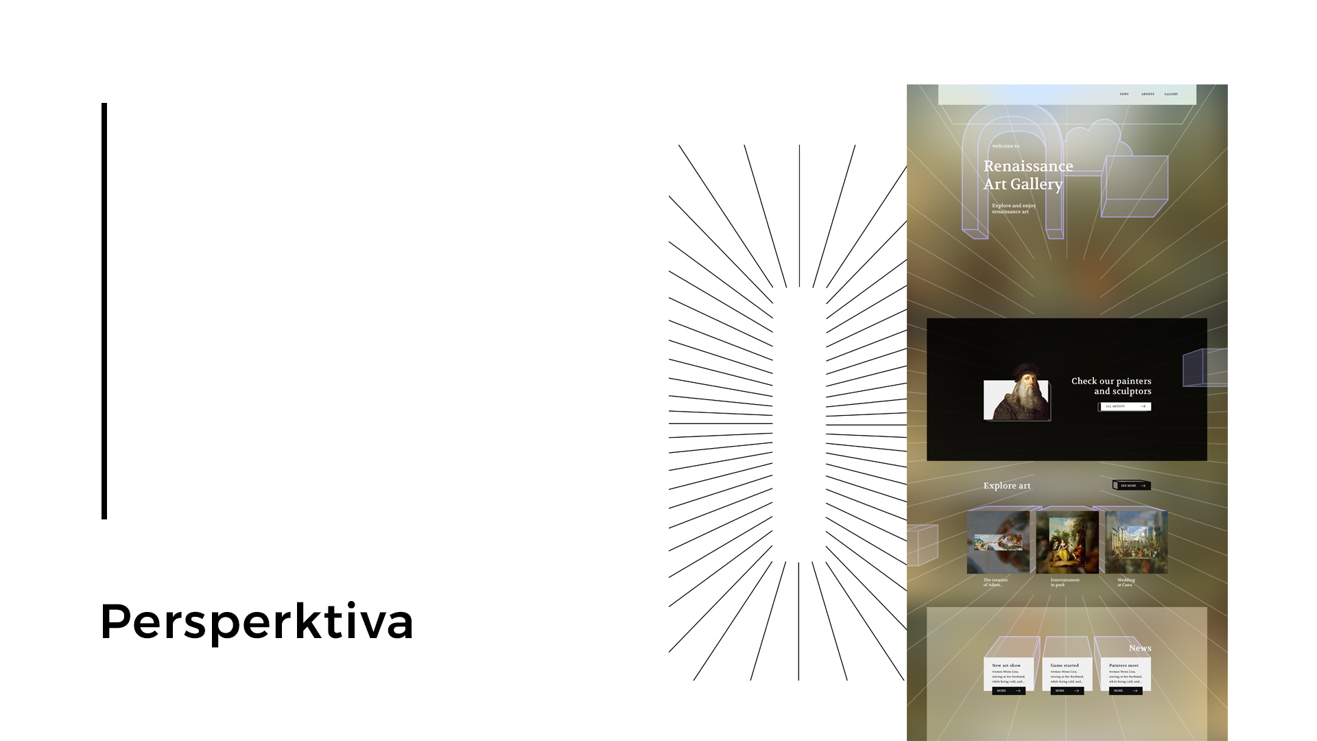 Vytvořil jsem Online galerií/portfolio renesančních umělců, pro jejich dobovou prezentaci. Pracoval jsem hodně s persperktivou, která renesanci zasáhla. Persperktivu můžeme najít v opravdu mnoha obrazech, proto layoutem webu jsou osy persperktivy na které se připojují prvky, jako kdyby web kreslili renesanční umělci.