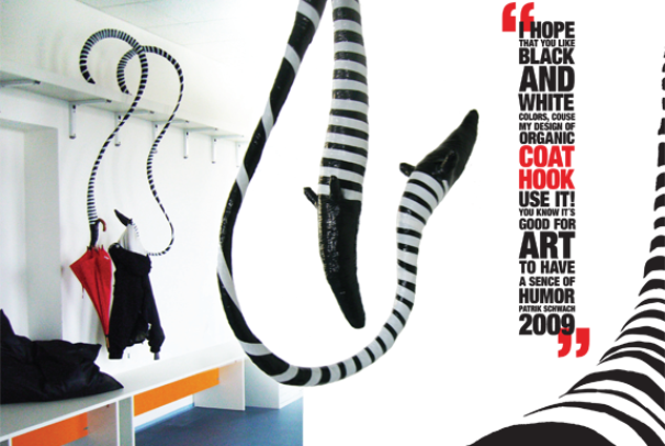 Koncept vešáku je principielne navržen jako zavesitelný prvek na podhledové desce. Oba dva vešáky jsou vyrobeny z 10 mm armovací ocelové tyce, obalené strecovou fólií v kombinaci s lepící páskou. Vnejší design vešáku tvorí vrstva cerné a bílé lepící pásky, v tomto prípade tvorící vzájemné spirálovité pruhy.