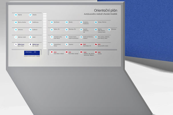 Vytvoření grafiky pro informační systém autobusového nádraží Uherské Hradiště. Hlavním cílem naší snahy bylo zpřehlednit a zkompaktnit celkový systém dopravy a dopřát lidem příjemnější a odlehčenější výraz designu informací na tomto rušném místě.