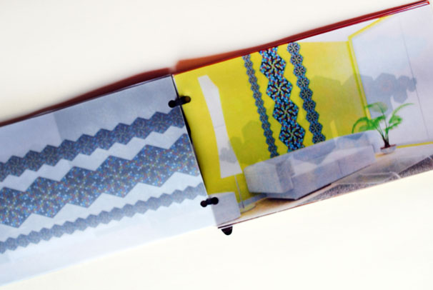 Ornament vznikl z dětské hry mozaika. Jejím následovným zpracováním jsem chtěla vytvořit novou možnost využití polepů na stěnu v interiéru.