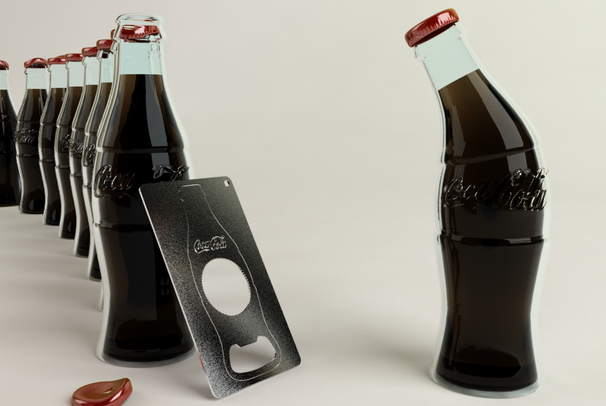 Řešení kapesního otvíráku ve stylu kreditní karty. Tento otvírák umožňuje otevřít veškeré produkty společnosti Coca Cola.