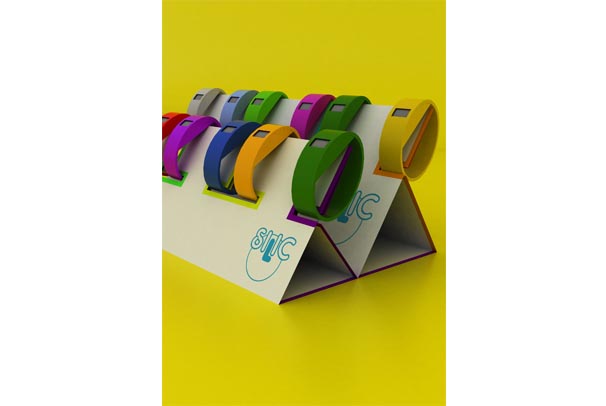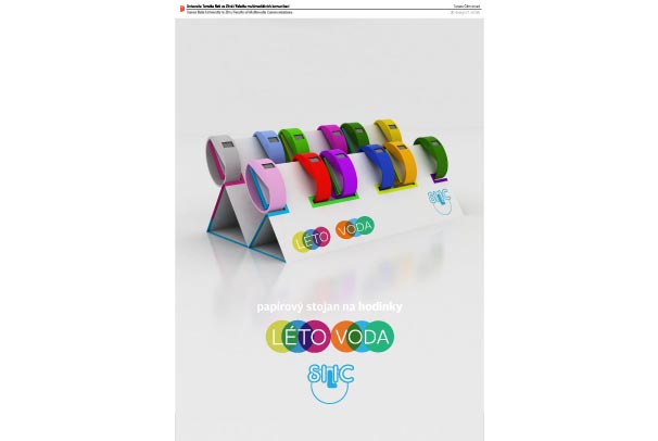 Gumové hodinky Silic se vyznačují svojí lehkostí, minimalistickým designem, voděodolností a jsou možny používat při jakékoli činnosti v létě. Papírový stojan na tento produkt je koncipován jako sezónní a to z důvodu zadaného materiálu - papíru, tak i nadcházející sezóny - léta. Lidé se v těchto měsících rozjíždějí všemi směry k vodě. Stojan by byl umístěn na čerpacích stanicích a v místech, spojených se zařizováním dovolené, ale také na koupalištích a v neposlední řadě v hračkářstvích a hodinářstvích. Jelikož se jedná o poměrně levné hodinky a barevná rozmanitost a univerzálnost hodinek přilákají pozornost - stojan vyvolá impulzivní nákup. Stojan má jednoduchou čistou grafiku, nechává vyniknout barevným hodinkám. Jedinými grafickými prvky na stojanu jsou logo společnosti, pak barevné okraje stojánku, které zajišťují barevnost stojanu při případném vykoupení hodinek. Dále je zde heslo ,LÉTO’ a ,VODA’, které je umístěno do barevných bublin - ty spolupracují s logem, které také obsahuje kruh. Stojan je složen ze dvou částí, které dle konkrétního prostoru mohou být jak samostatně, tak i pospolu. Do každé části se vejde 6 hodinek, tedy do obou 12.