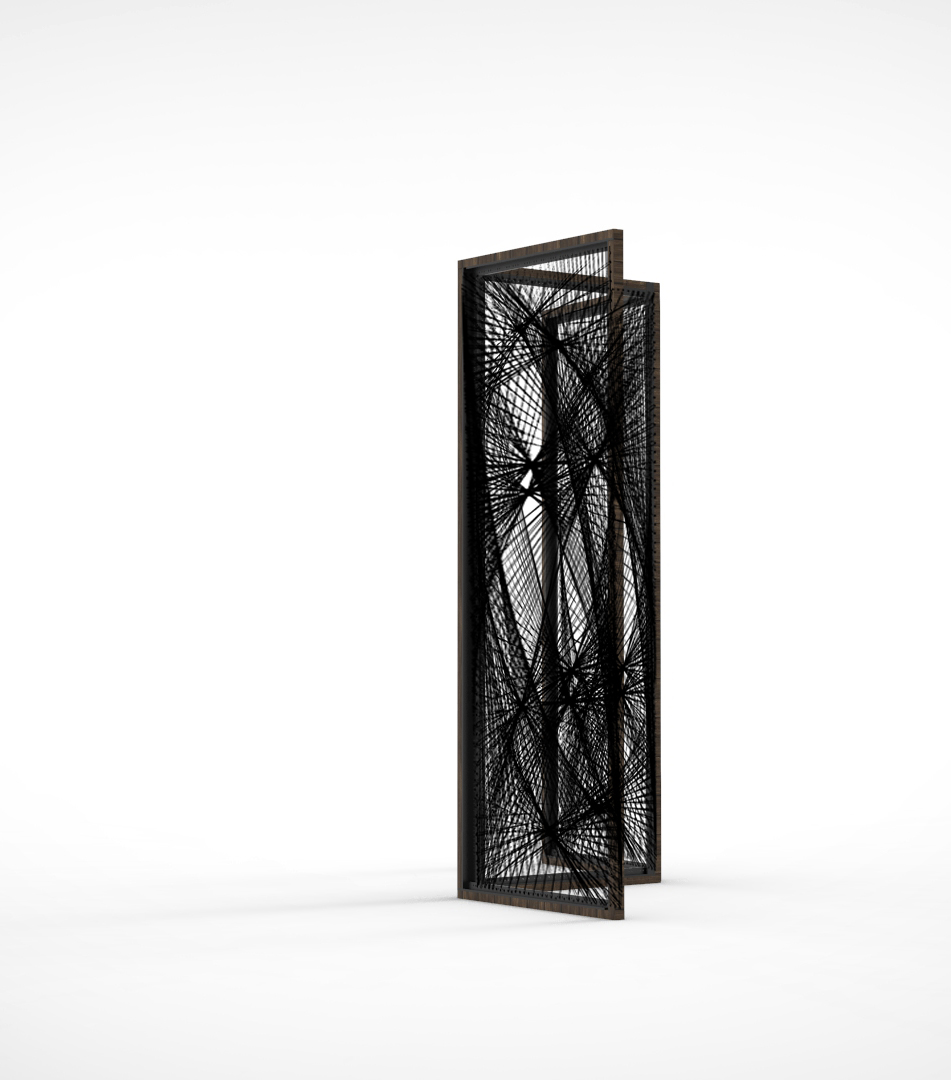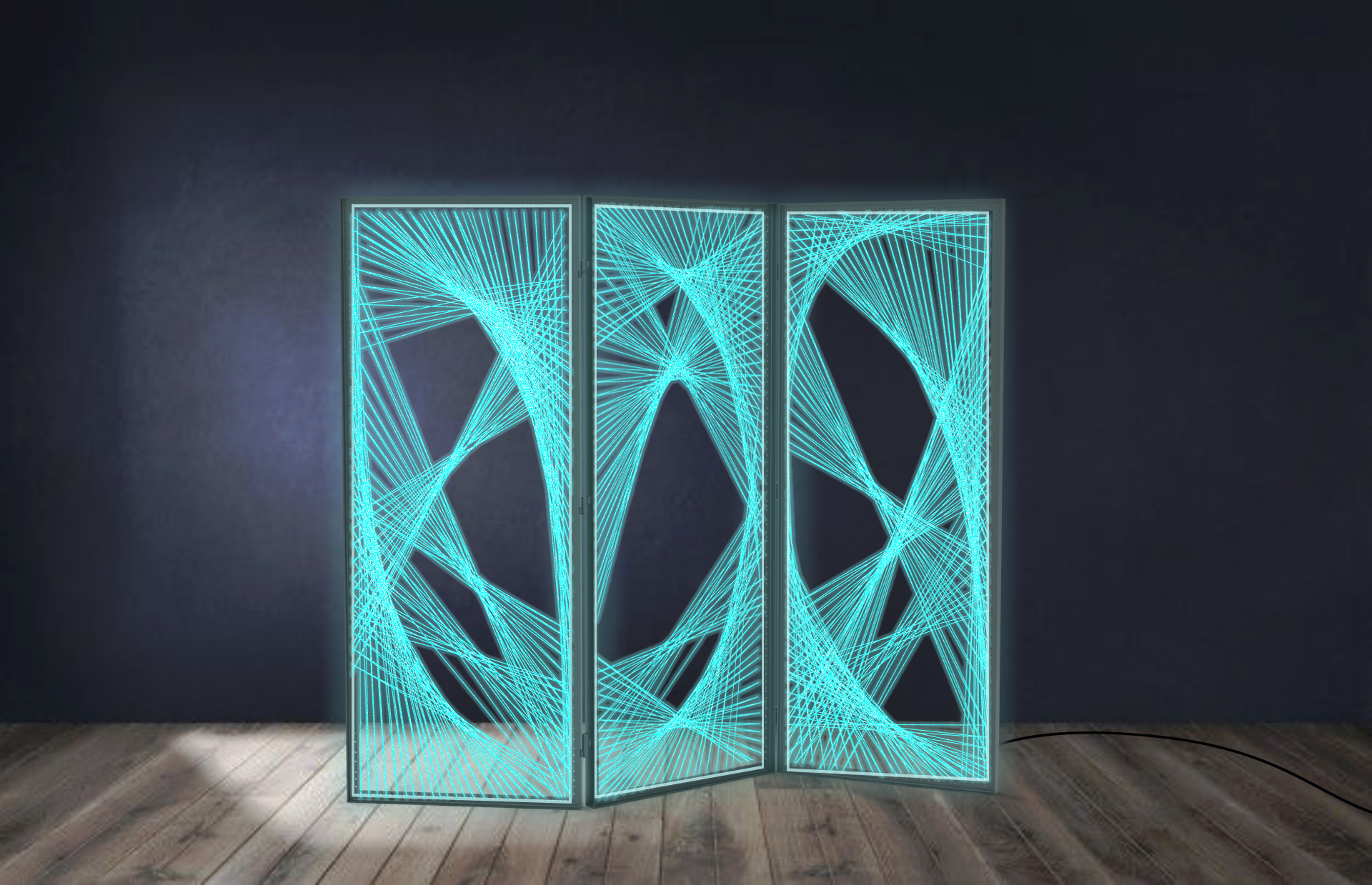 Paraván je inspirovaný String artem, kostra je svařená z ocelových T profilů s otvory, pro proplétání nylonového lanka.