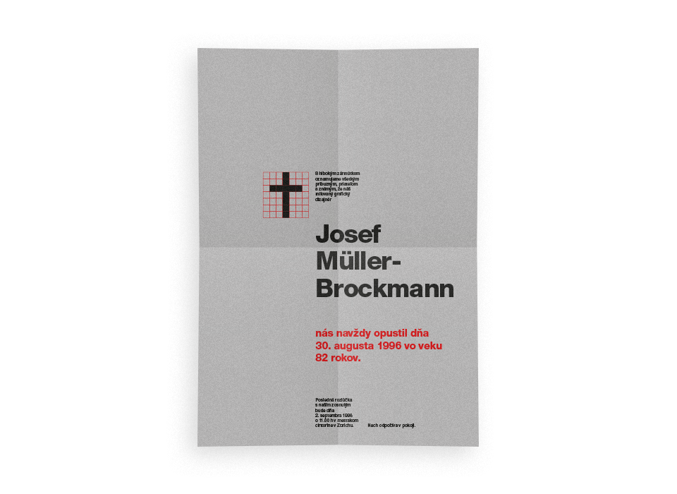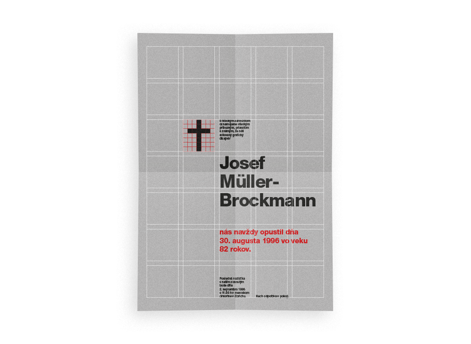 Parte osobnosti a grafika Josefa Müller-Brockmanna vytvorené technikou použitia gridu, ktorá patrí k jeho najvýznamnejším prínosom pre grafický dizajn. Parte je zároveň doplnené o jednoduché sans-serifové písmo a typickú farebnosť pre jeho práce.