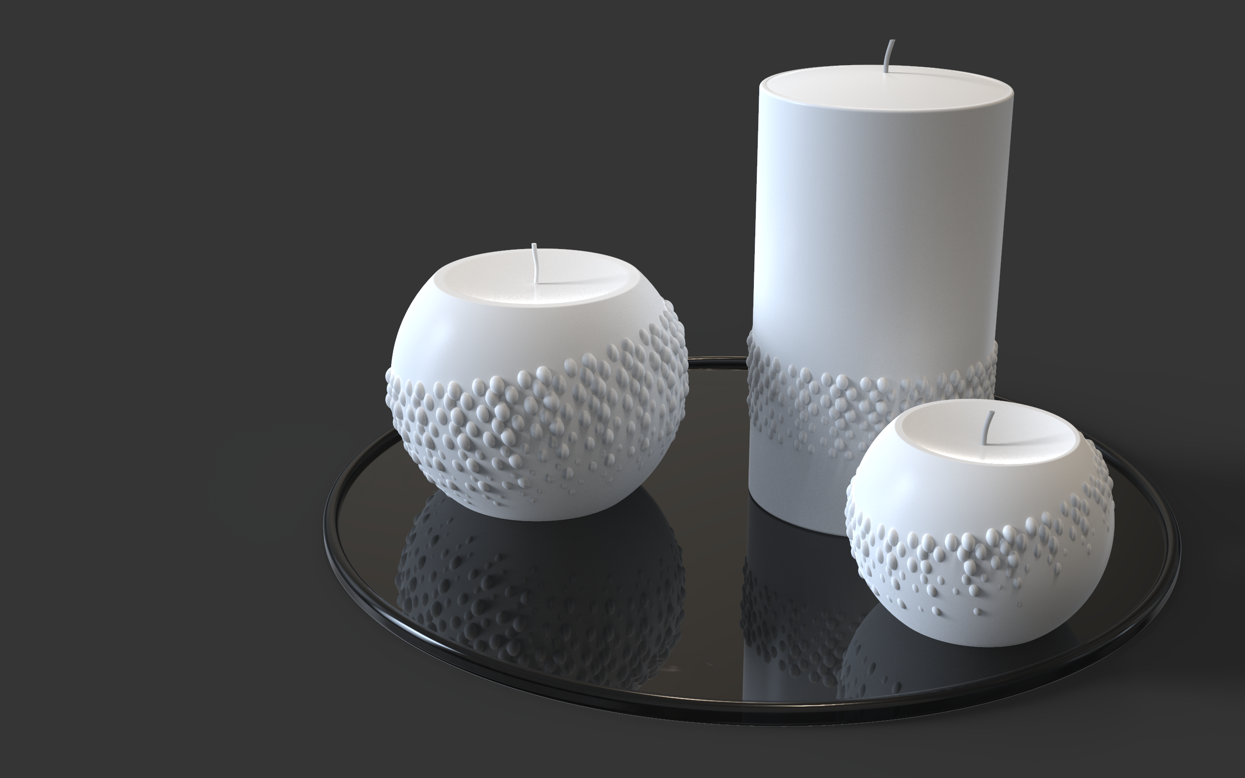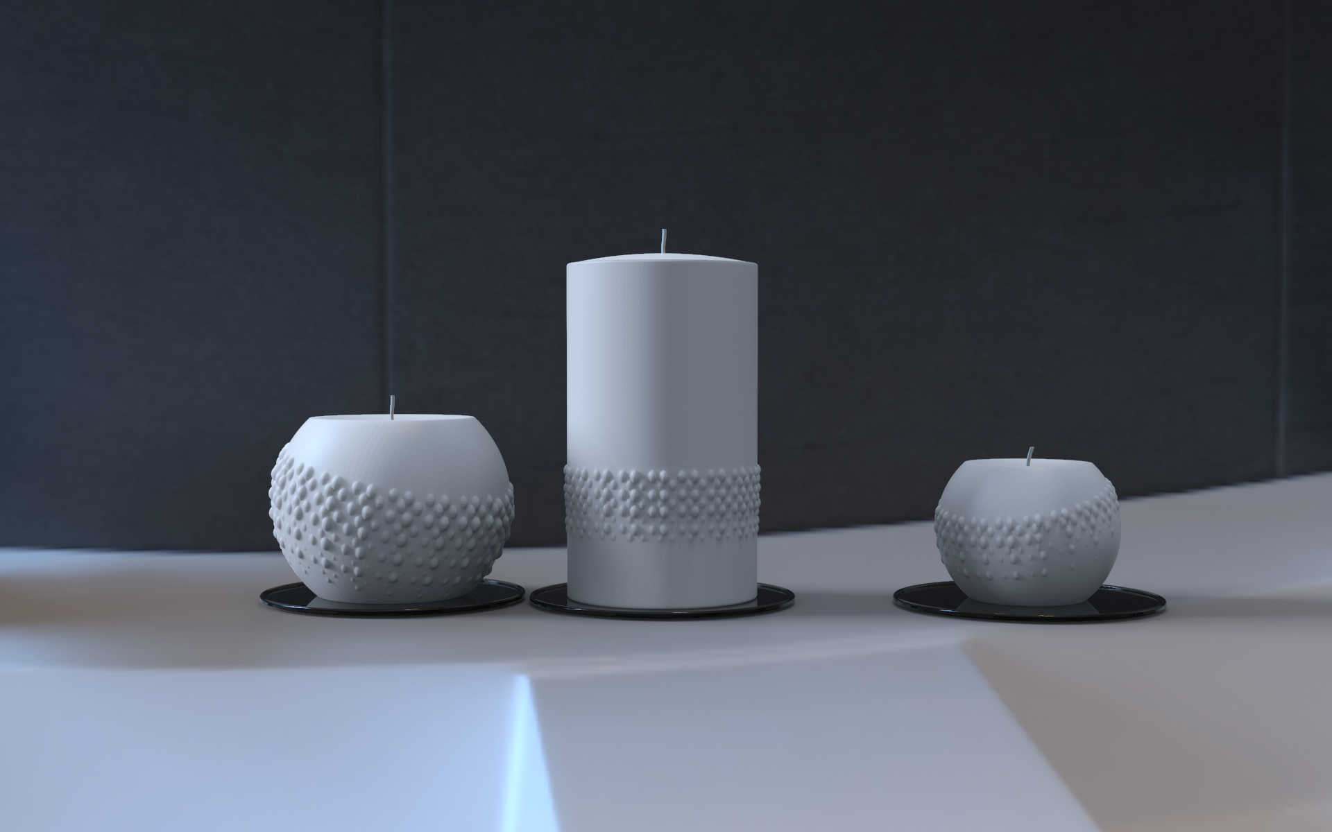 Elegantní svíčky s aplikací kombinatoriky. Struktura je inspirovaná kapkami stékajícího vosku. Postupným zapouštěním a vynořováním vznikla textura připomínající perly.