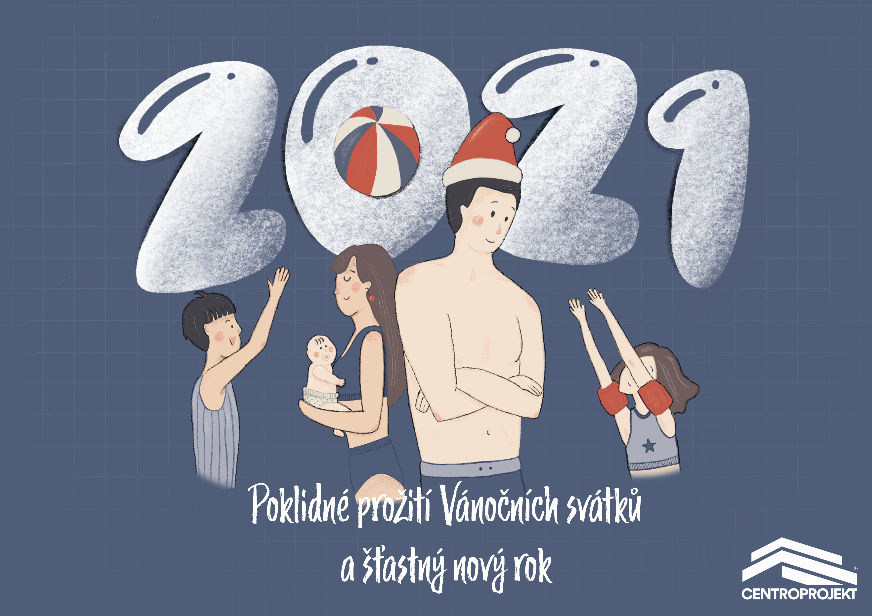 Zadáním práce bylo vytvořit pf pro zlínskou firmu Centroprojekt, která je primárně zaměřená na koupaliště. Vytvořila jsem jednoduchou ilustraci, kde jsem spojila Vánoční prvky, postavy, kterýma jsem chtěla PF personalizovat, a prvky bazénu. Do pozadí jsem použila texturu, která má připomínat kachličky v na dně a bocích bazénu, také jsem se snažila podpořit myšlenku bazénu nafukovacím kruhem a balónem.