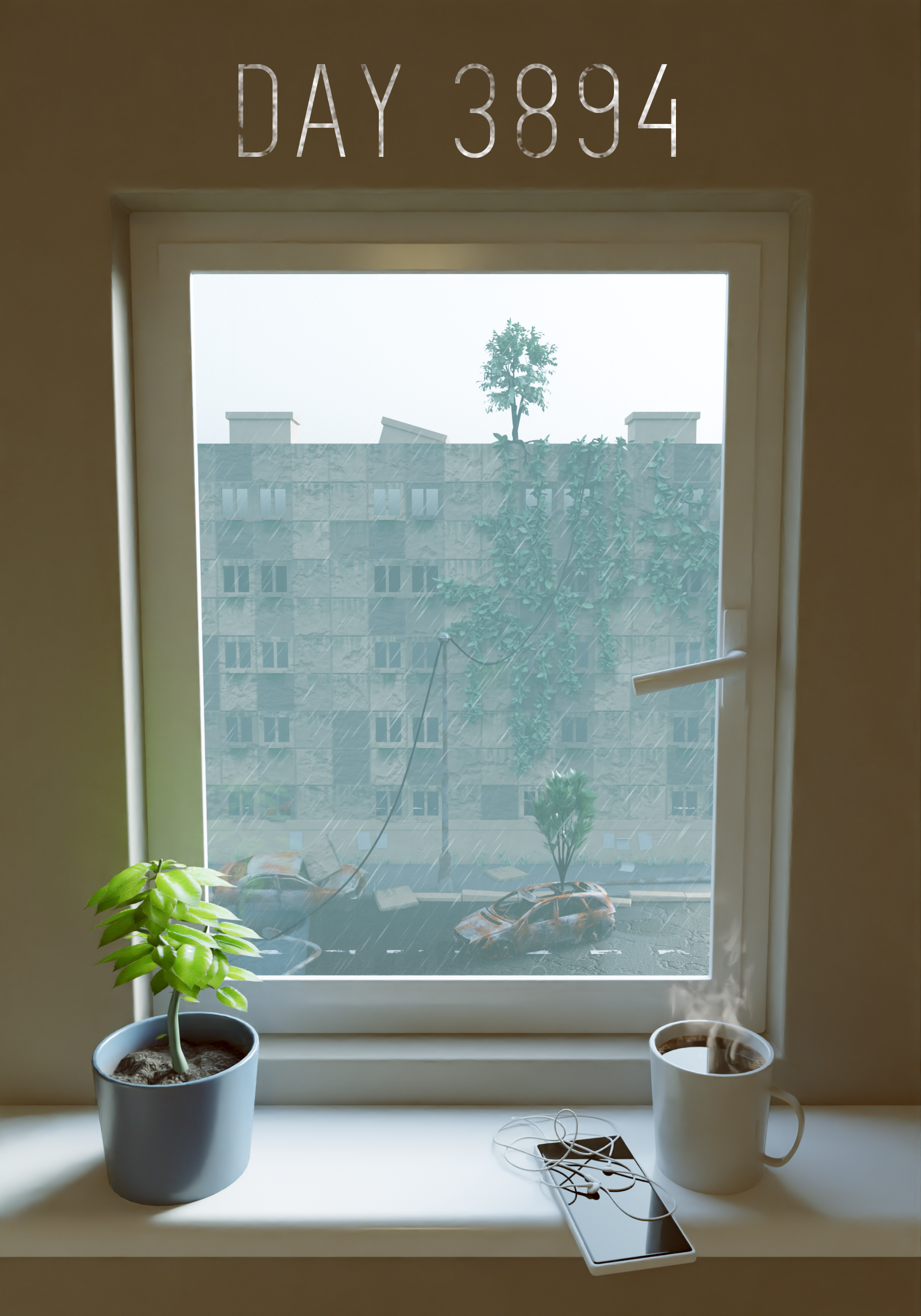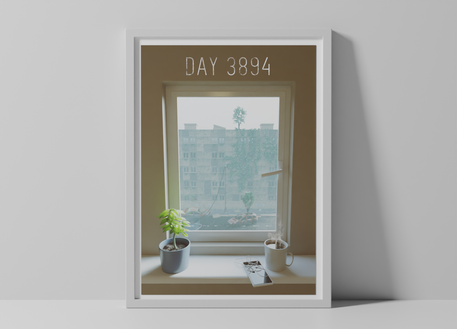 Můj plakát s názvem Day 3894 je obrazem budoucnosti, kdy koronavirová karanténa nikdy neskončila a stále přichází další a další vlny nákazy. Nikdo už nechodí ven, žádná auta nejezdí po ulicích, veřejné prostory nemá kdo udržovat a příroda pomalu dobývá města plná lidí zavřených doma. Zneklidňující exteriér je v ostrém kontrastu s klidem, všedností a pečlivě udržovanou neměnností interiéru - prostoru, na který se zmenšil svět každého z nás. Tyto dva prostory přitom odděluje pouze tenká tabulka skla.