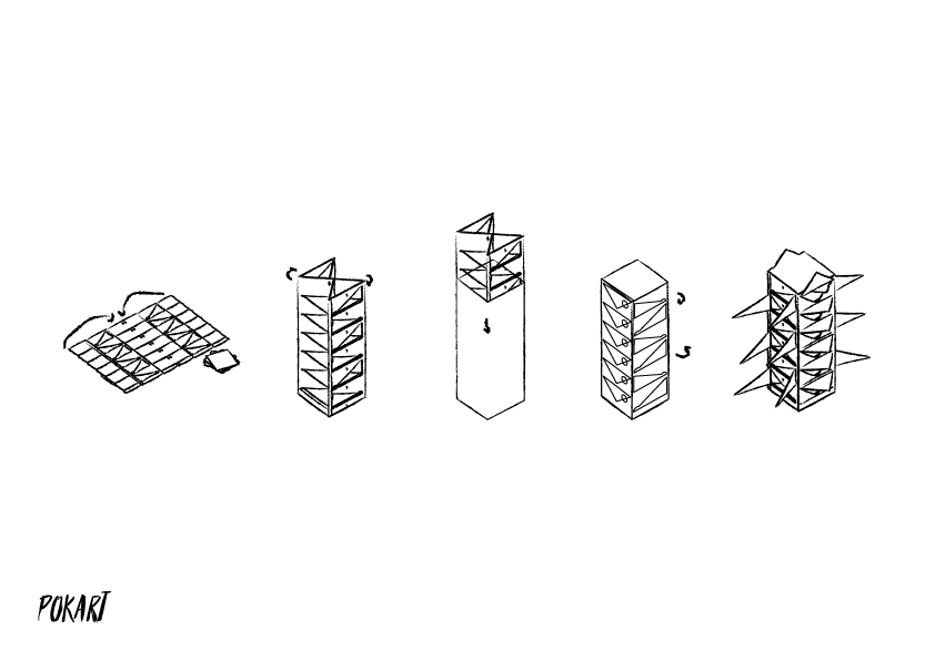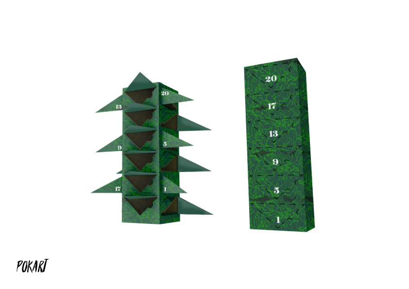 Adventný kalendár v tvare kvádra, ktorý sa mení v vianočný stromček, otváraním okien.