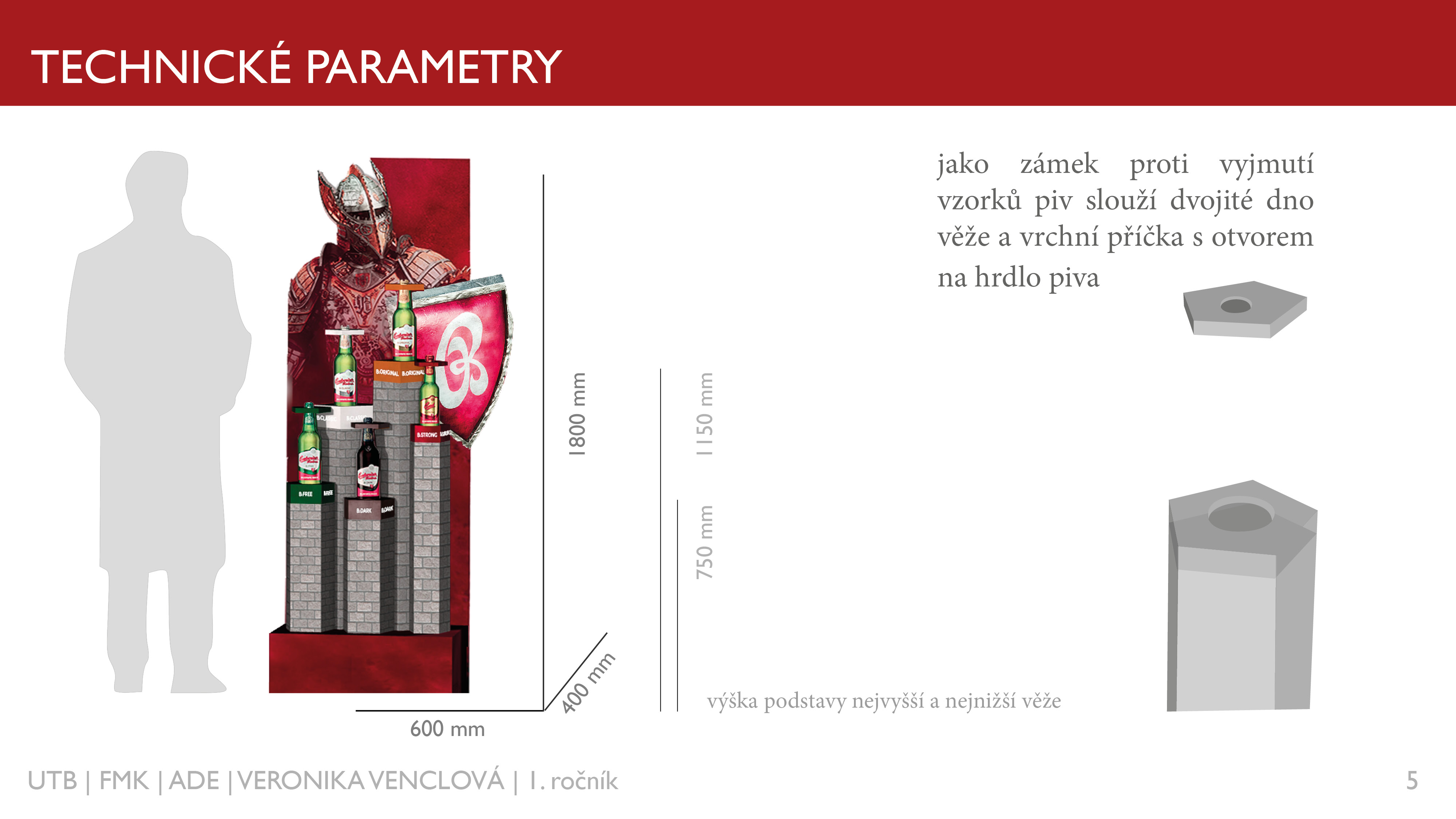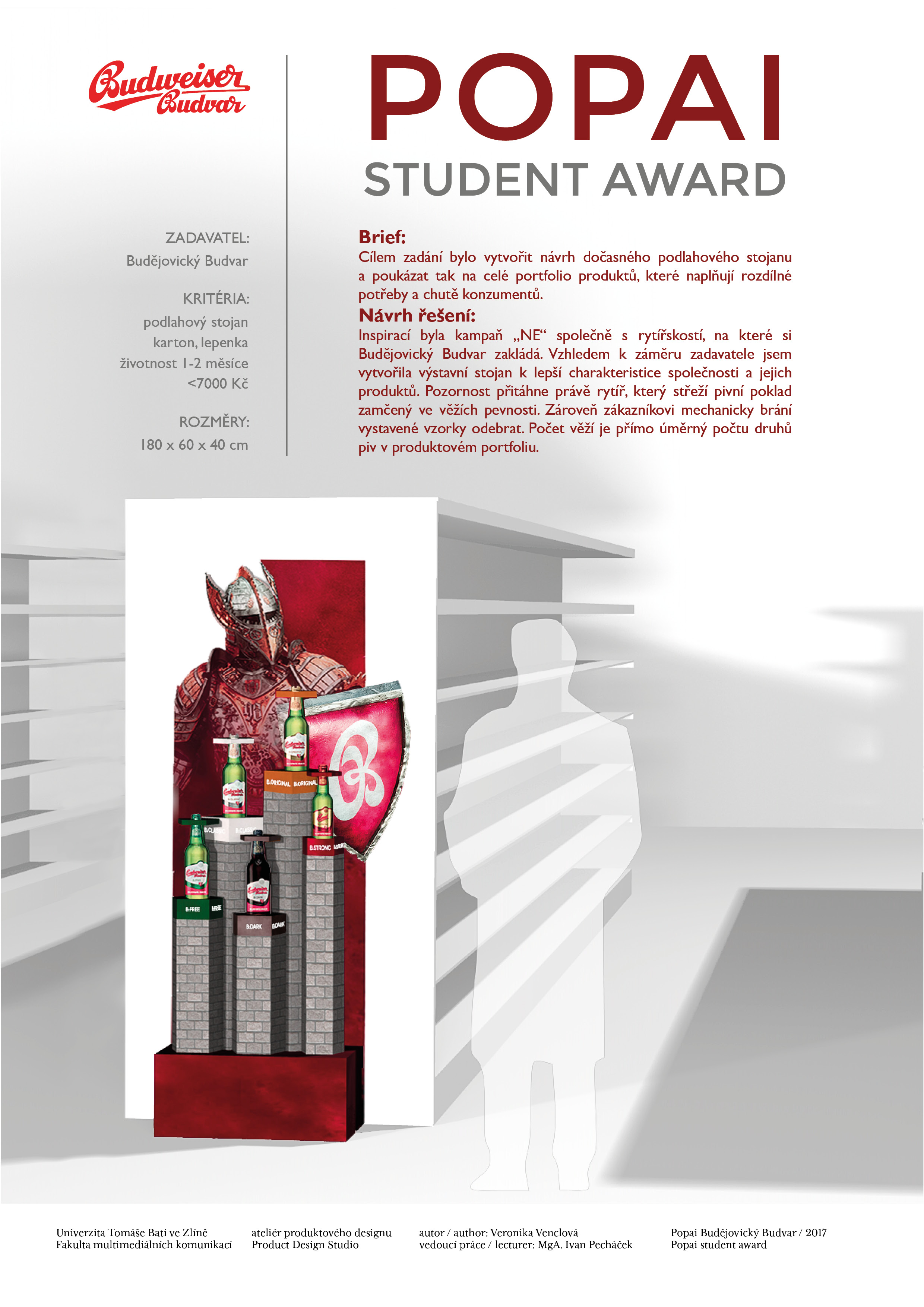 Hlavním motivem výstavního stojanu pro značku Budějovický Budvar je rytíř z kampaně "NE", který střeží pivní poklad zamčený ve věžích pevnosti. Zároveň zákazníkovi mechanicky brání vystavené vzorky odebrat.