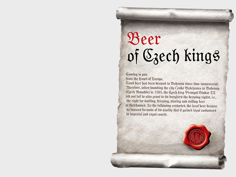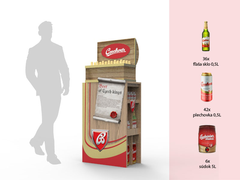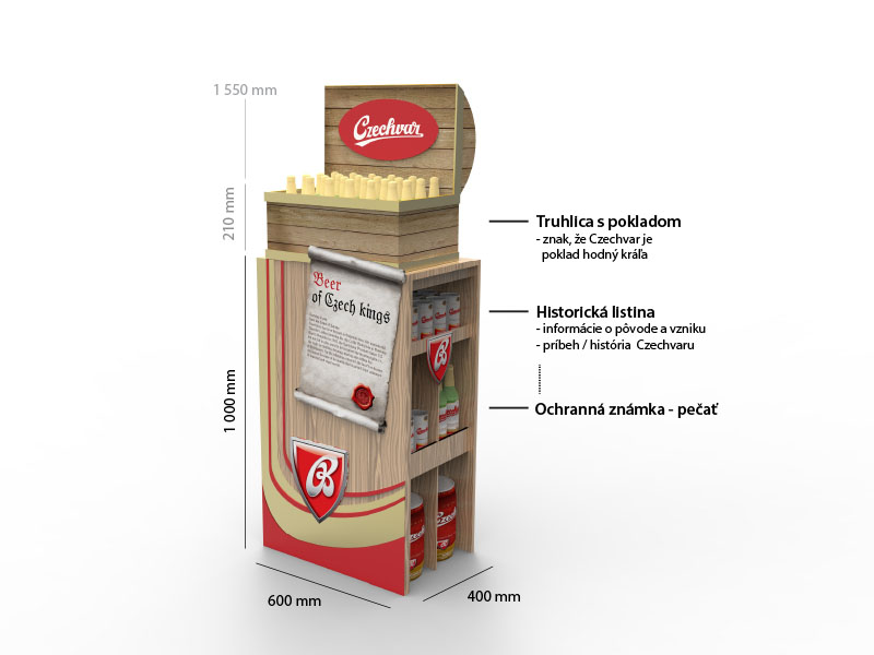 Dočasný podlahový stojan do špecializovaných predajní na alkohol na americkom kontinente pre Czechvar inšpirovaný vznikom a históriou Czechvaru. Odkazuje na to, že pivo Czechvar je pivo od kráľov pre kráľov. Už v minulosti králi vedeli, že Czechvar prémiové a nadčasové kvalitné pivo hodné kráľov. Imitácia dreva má pomôcť stojanu zapadnúť do prostredia predajne a zároveň vyvolať pocit remeselnej ručnej výroby.
