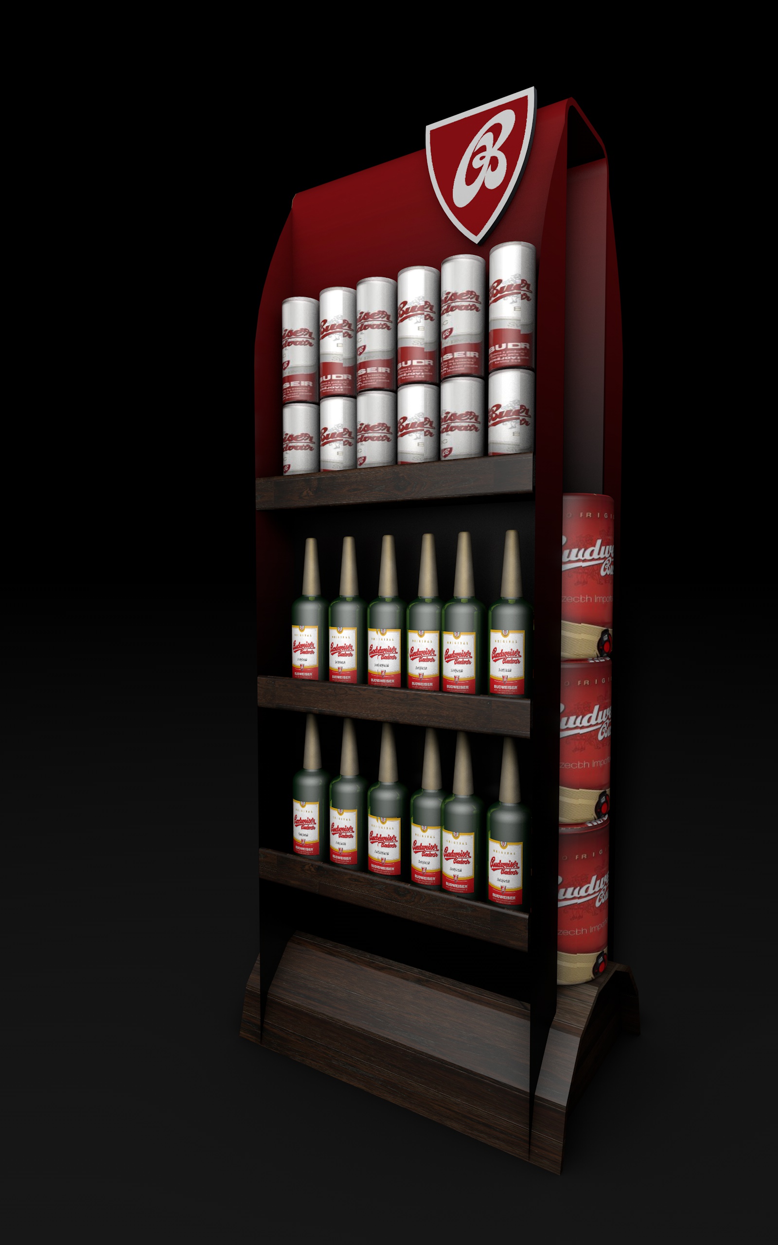 Papírový podlahový ostrůvkový stojan Budweiser Czechvar určený pro kanadský trh.