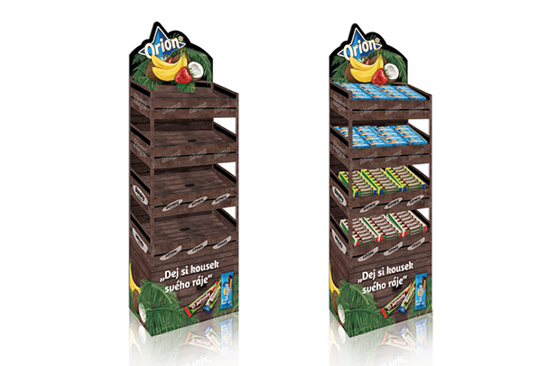 Návrh produktového stojanu pre tyčinky firmy Orion: Margot, Banány a Jahody. Riešenie spĺňa funkčné požiadavky na prevedenie stojanu a pracuje s dobre známym komunikačným riešením, ktorým je tematika raja. Okrem toho použitie sloganu " Dej si kousek svého ráje", bolo jedným z kritérií.