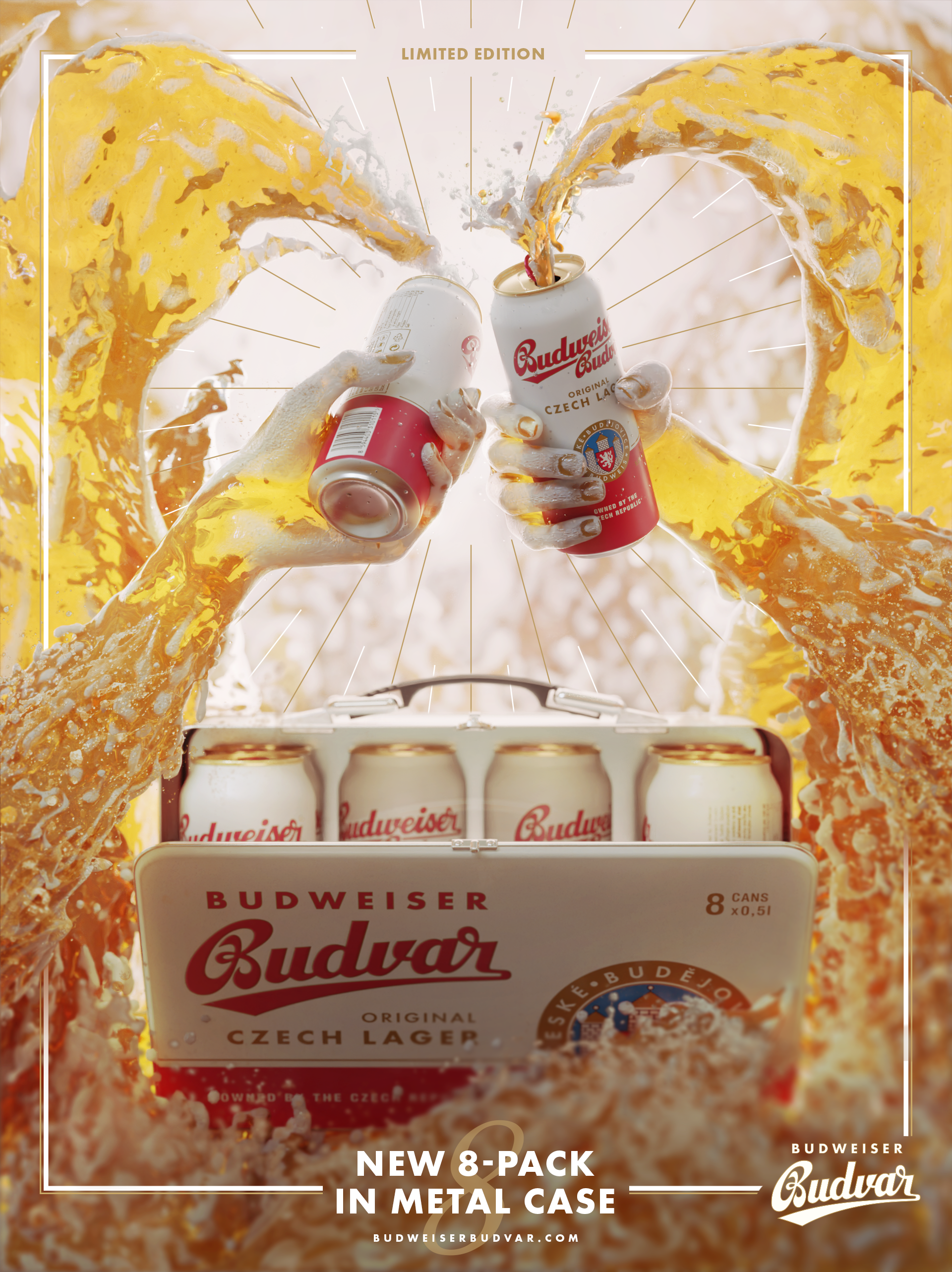 Plagát pre každoročnú súťaž Popai student awards. Zadaním bol vizuál pre limitovanú edíciu 8-packu piva Budweiser Budvar, s letnou tématikou. Realizoval som ho čiste esteticky, bez hľadania väčšej myšlienky alebo messeg-u. Plagát má vystihovať osvieživú chuť chladeného piva a opulentný objem spomínaného 8-packu. Zároveň má využitie teplých farieb evokovať letnú sezónu. Vizuál bol realizovaný liquid simuláciou a 3D sculptingom.