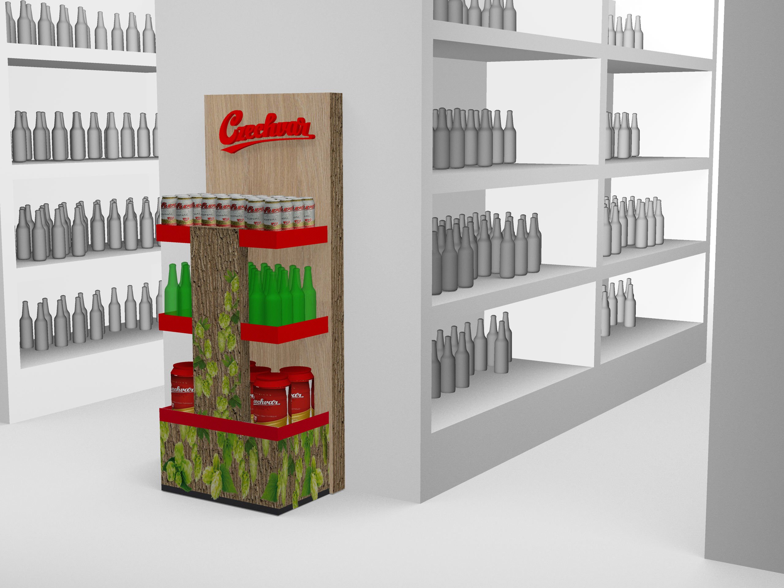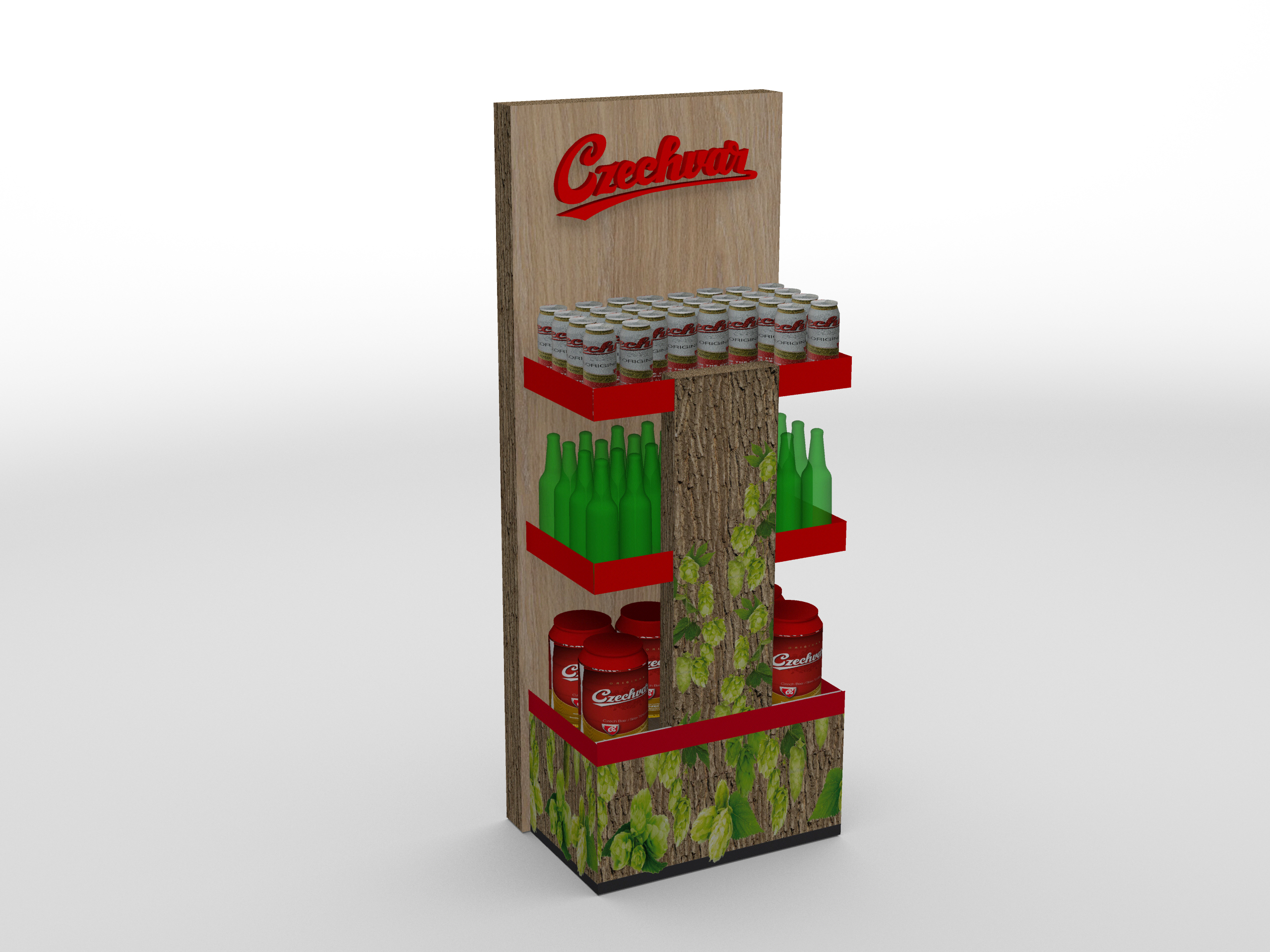 Dočasný výstavní stojan je inspirován dřevem. Při ručním opracování dřeva je potřeba poctivost, kterou se Czechvar pyšní. Vnější strany stojanu tvoří kůra, která představuje neopracovanou část, vnitřní poté již opracované dřevo. Chmel, kterým je stojan porostlý znázorňuje poctivost surovin. V horní části stojanu se nachází logo. Stojan je určen na 28ks plechovek, 28ks lahví a 6ks soudku.