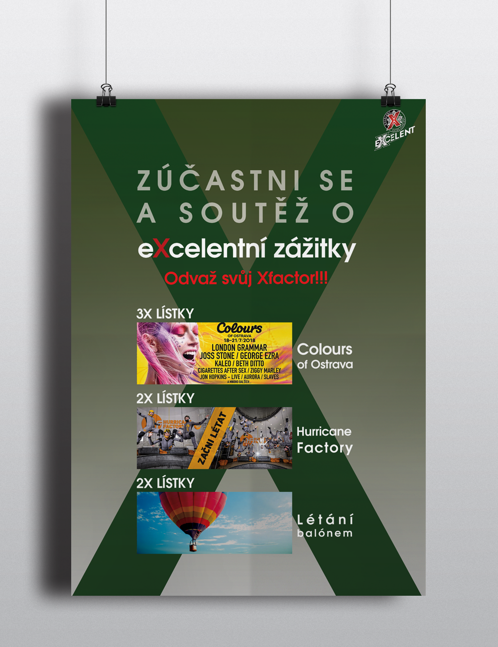 Mojím cieľom bolo podnetiť nakupujúcich ku kúpe party balenia pív. Ponúka im výhru zážitkových cien, ktoré majú za úlohu odviazať ich X-faktor. Hlavnou cenou sú lístky na Colours, čo priláka najmä vekovú kategóriu, na ktorú sa snaží eXcelent zamerať. Súťaž funguje na základe zlepovacích nálepok, ktoré sa nachádzajú na vnútornej spodnej časti krabice. Ak je na obrázku dostatočný počet X, je možné sa zapojiť do druhého kola súťaže na webe.