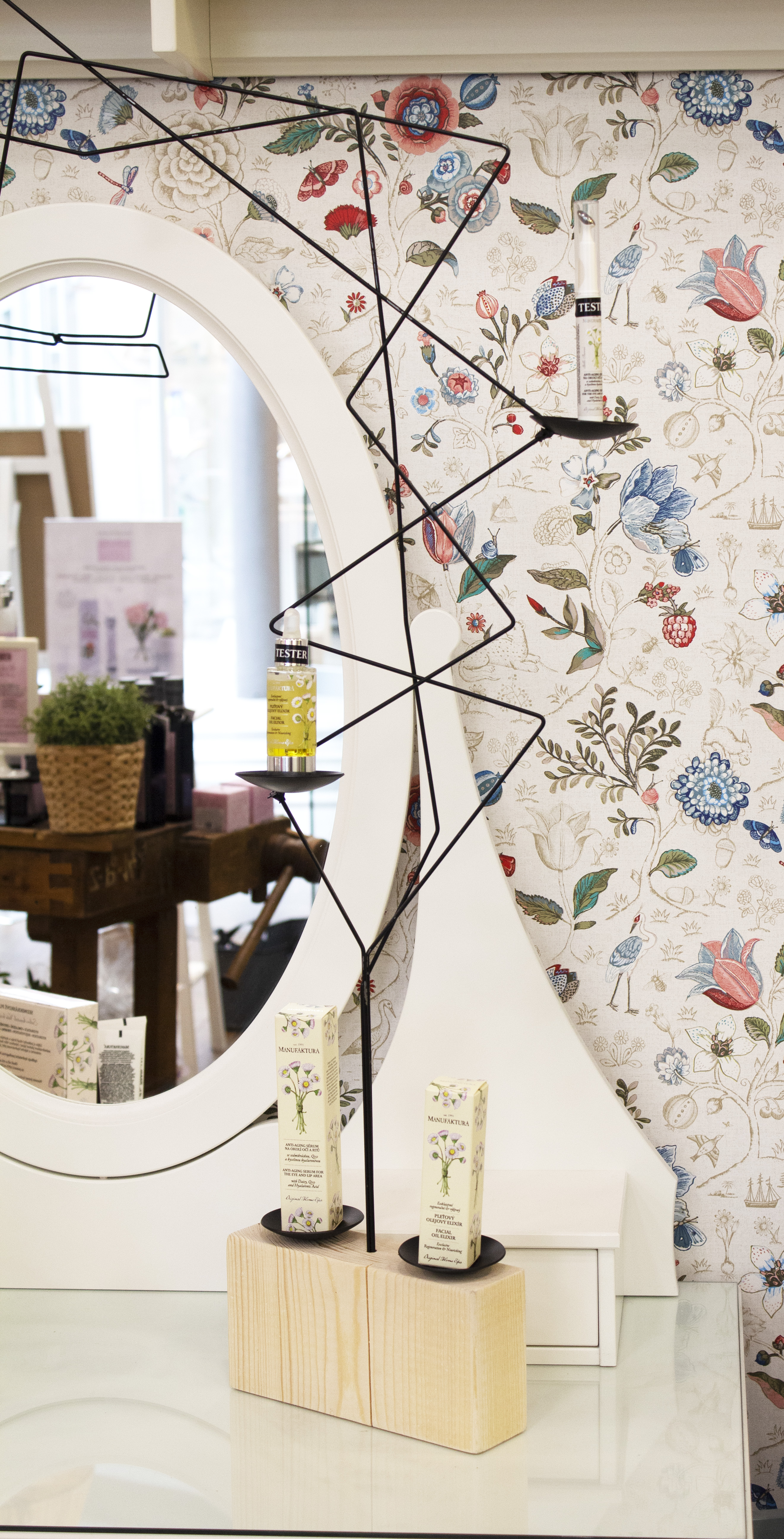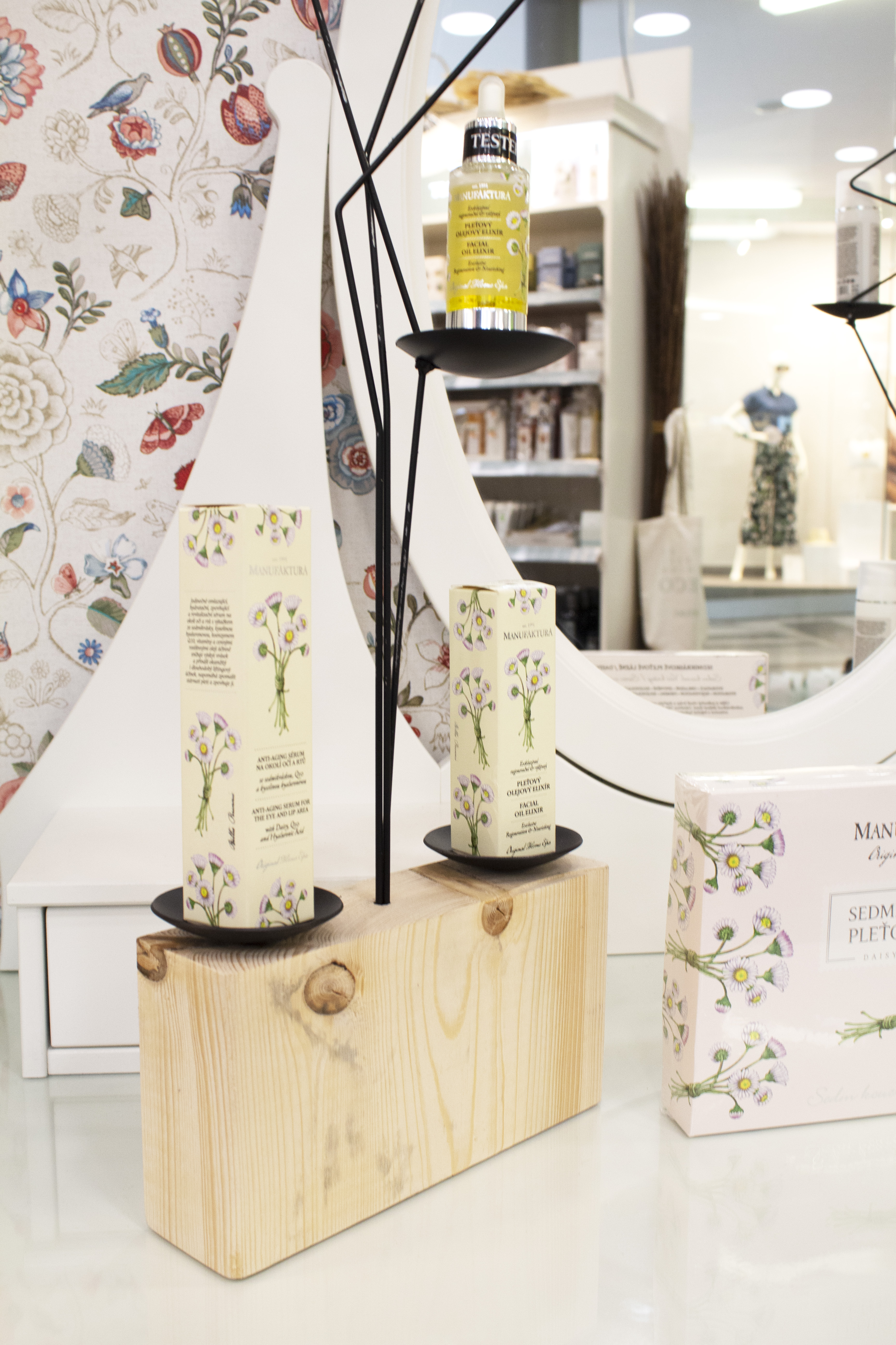 Jedná se o jednoduchý geometrický objekt, na kterém se nacházejí produkty sedmikráskové řady od Manufaktury.