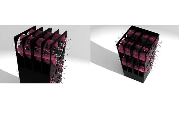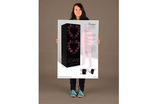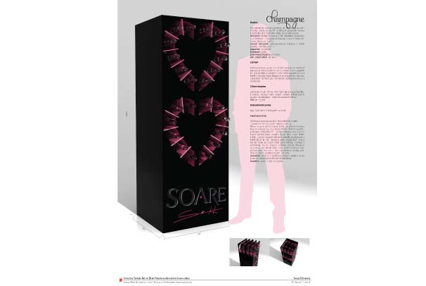 Hlavní emoce při kupování květin je převážně láska, kladné vřelé pocity, za účelem někoho drahého potěšit, překvapit. Proto hlavním motivem stojanu jsou 4 srdce, hlavní symbol lásky, obsahující 48 lahví dvou druhů sektů. Upoutání pozornosti jsem zařídila kontrastem, v květinářství je vše barevné, plné organických tvarů. Oproti tomu je stojan čistě geometrický, statický, s převládající černou barvou a detaily růžové.