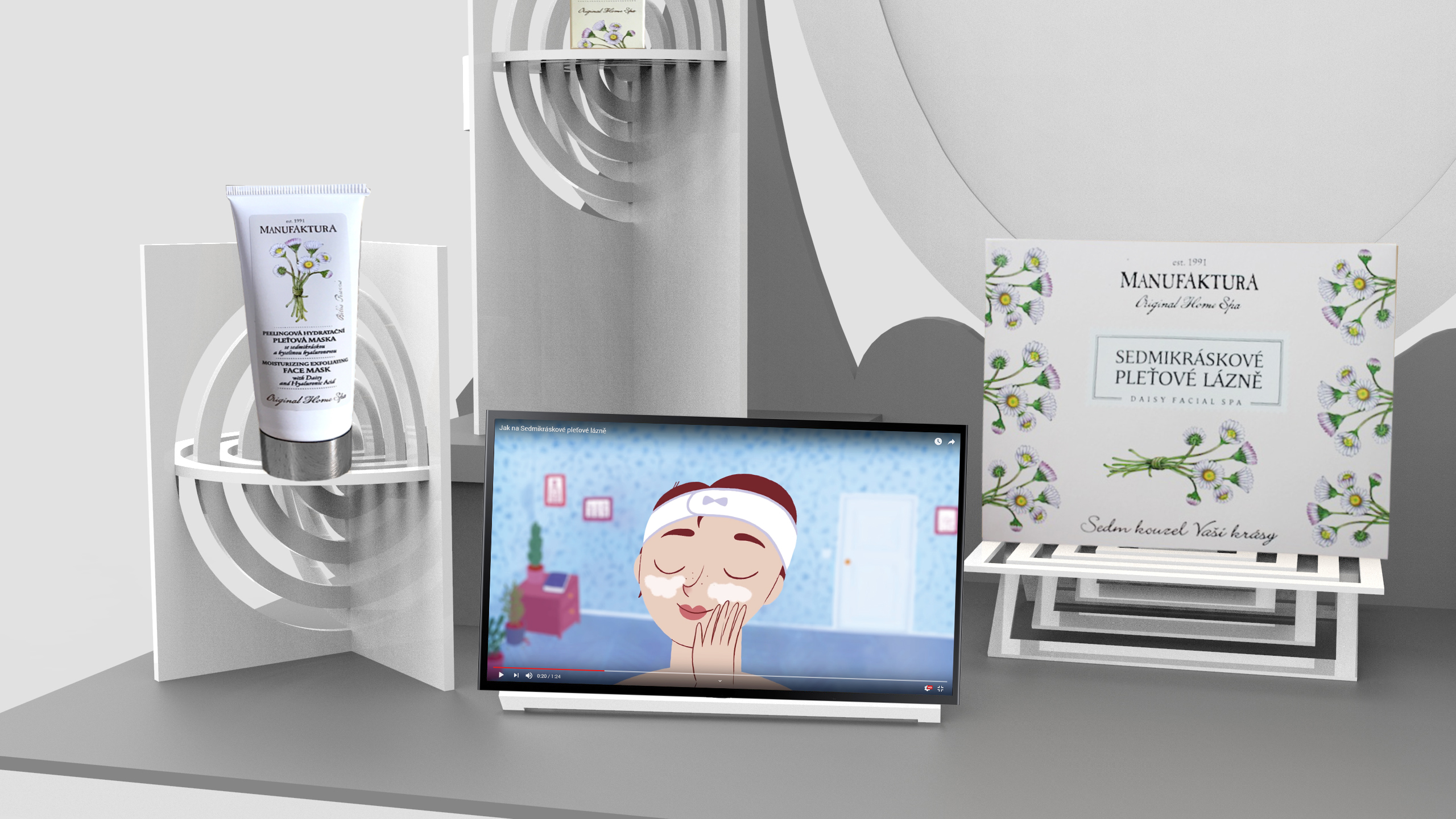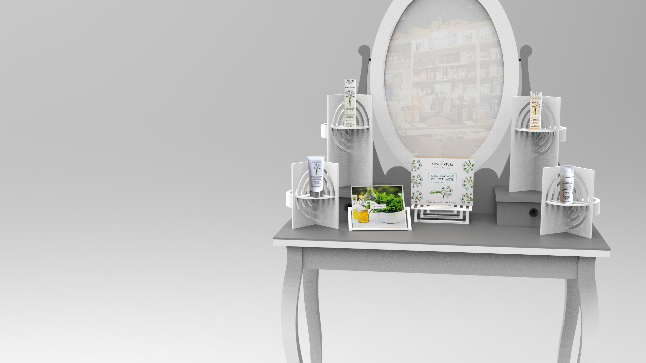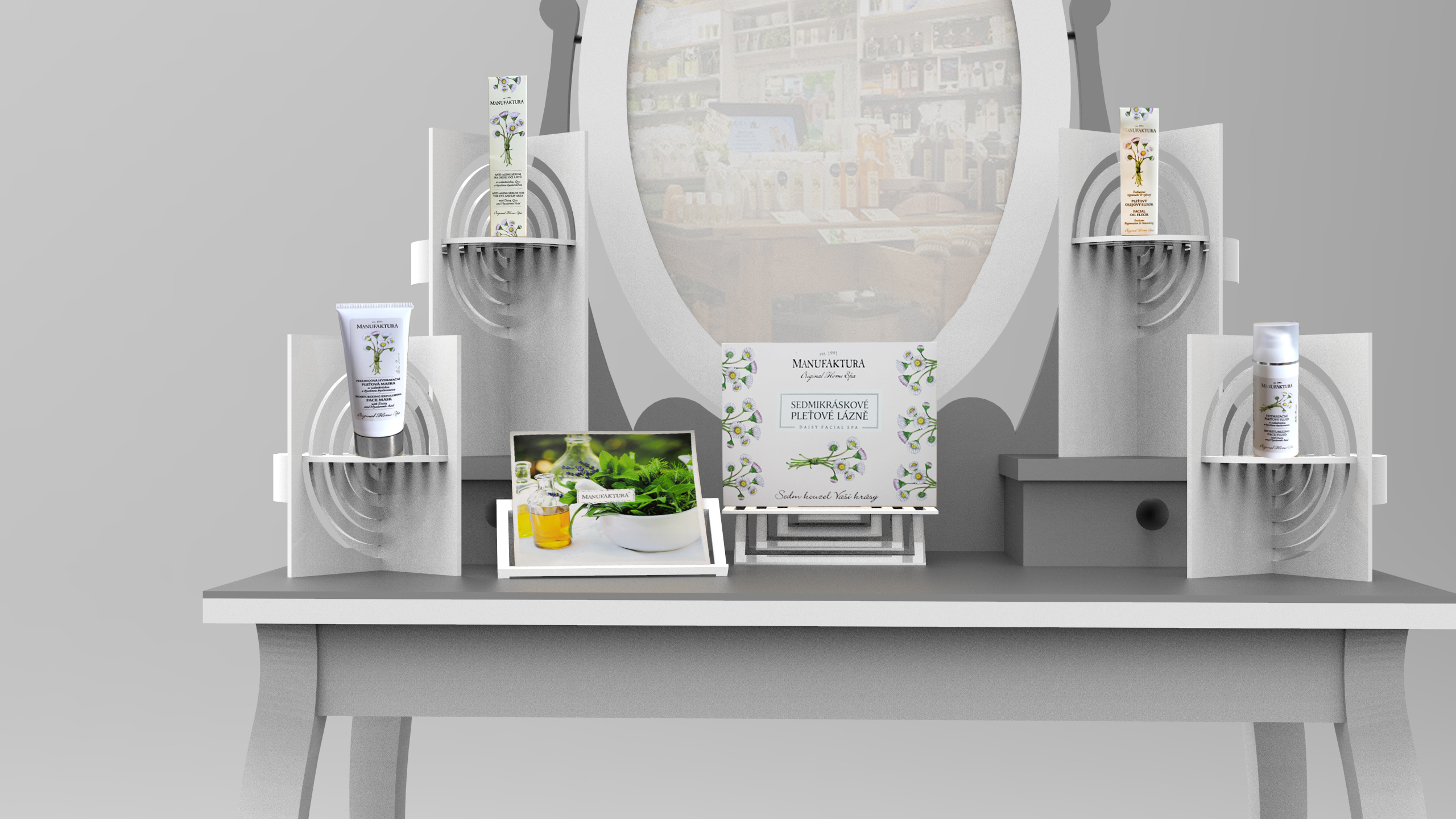 Návrh reklamních stojanů na kosmetické produkty značky Manufaktura v rámci soutěže.