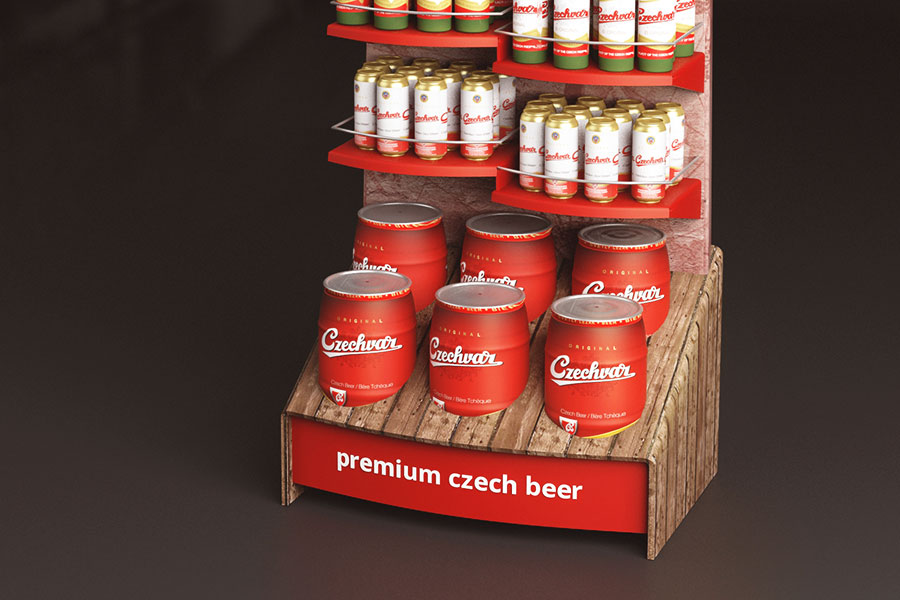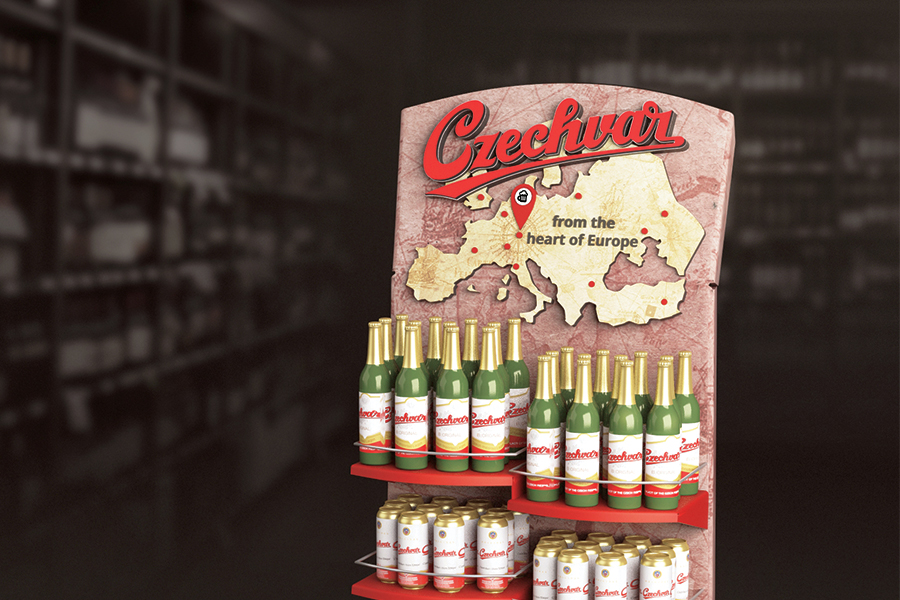 Koncept stojanu Czechvar je založený na edukatívnom prvku - mape. Objasňuje zákazníkovi lokalitu piva Czechvar, ktorá je znázornená pinom na mape a podporená claimom From the heart of Europe. Bodovo je znázornený aj export piva do ďalších krajín.