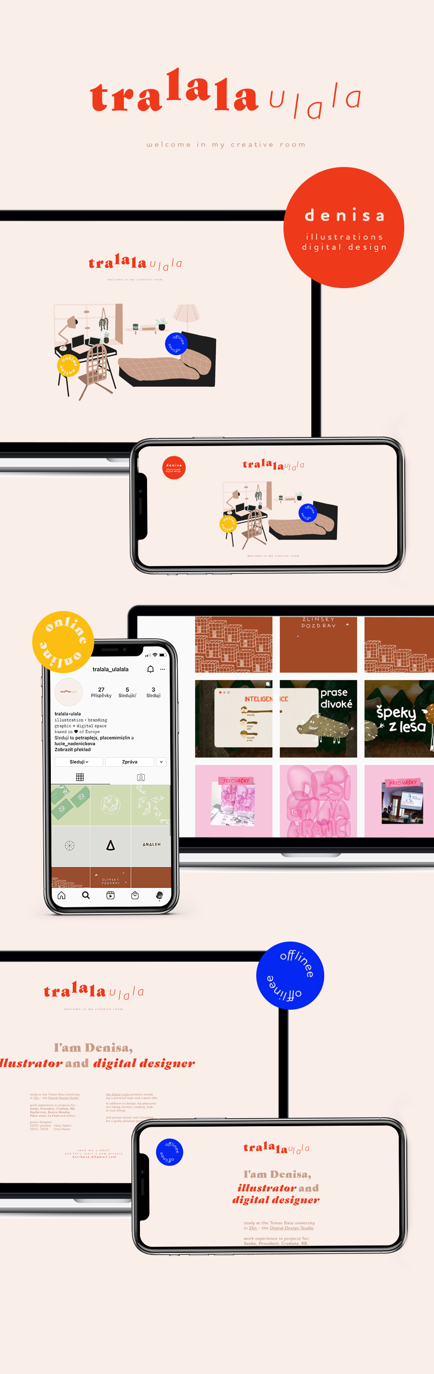 V mém osobním portfoliu jsem chtěla prezentovat primárně věci, které mě baví nejvíc, a kterým bych se chtěla do budoucna věnovat. Divákovi ihned při první návštěvě webu nastiňuji styl a náladu mé práce. Pomocí buttonů je pak možnost překliknout se na podstránku OFFLINE, kde jsou o mně podrobnější informace (pracovní zkušenosti, komerční projekty, vzdělání, záliby..), nebo na podstránku ONLINE, která směřuje na instagramový profil, kde své práce prezentuji detailněji (využívám výrazného pruhového layoutu). Vizuální stránku i layoutové rozložení plánuji v budoucnu použít jako základ pro tištěné portfolio s výběrem prací.