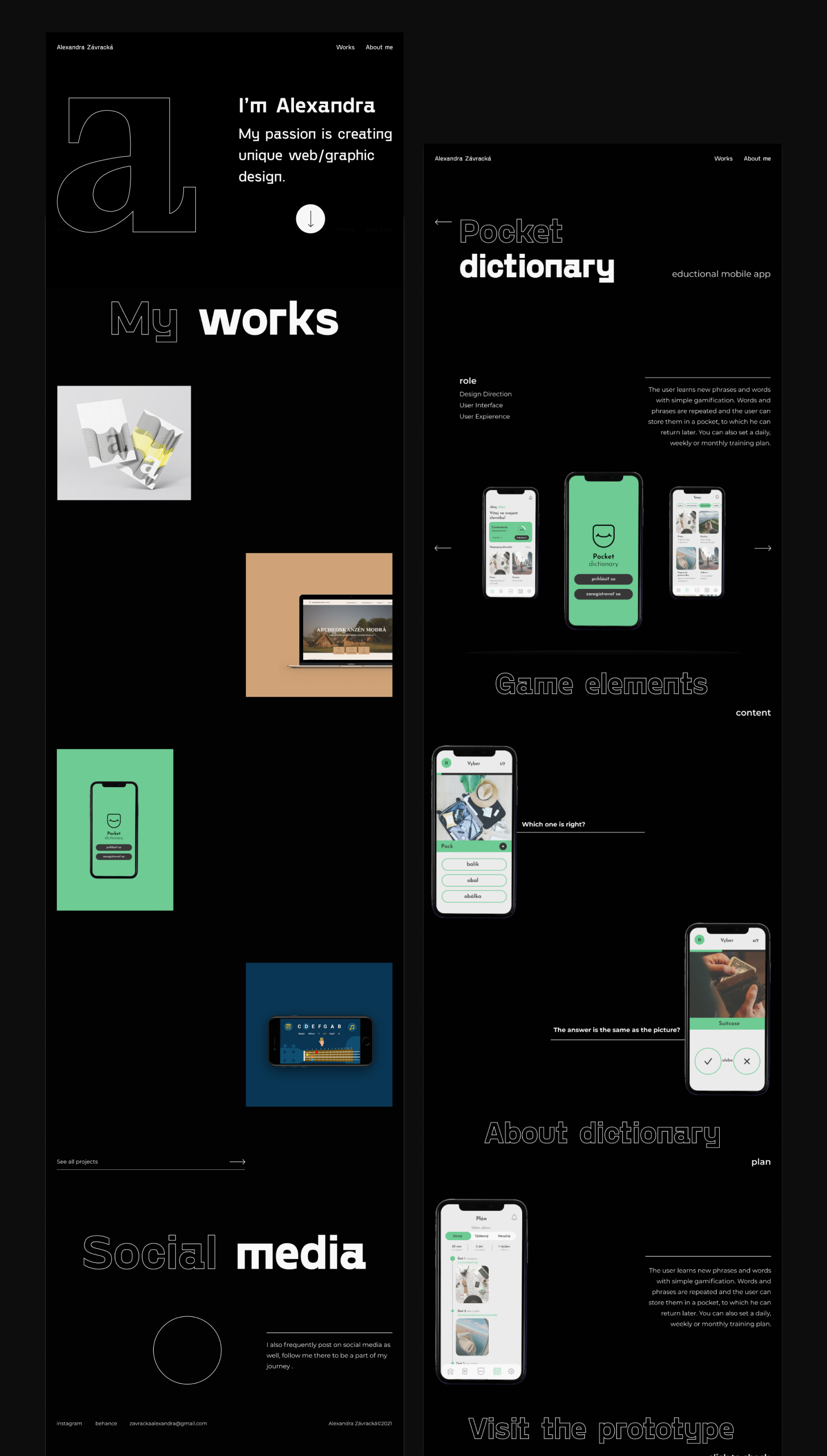 Vlastné webové portfólio. Pri vytváraní portfólia som sa rozhodovala medzi čiernym a bielym pozadím. Zvolila som čierne, ktoré som skombinovala s bielymi nápismi a prvkami. Celé je to jednoduché a prehľadné aby práce čo najviac vynikli.