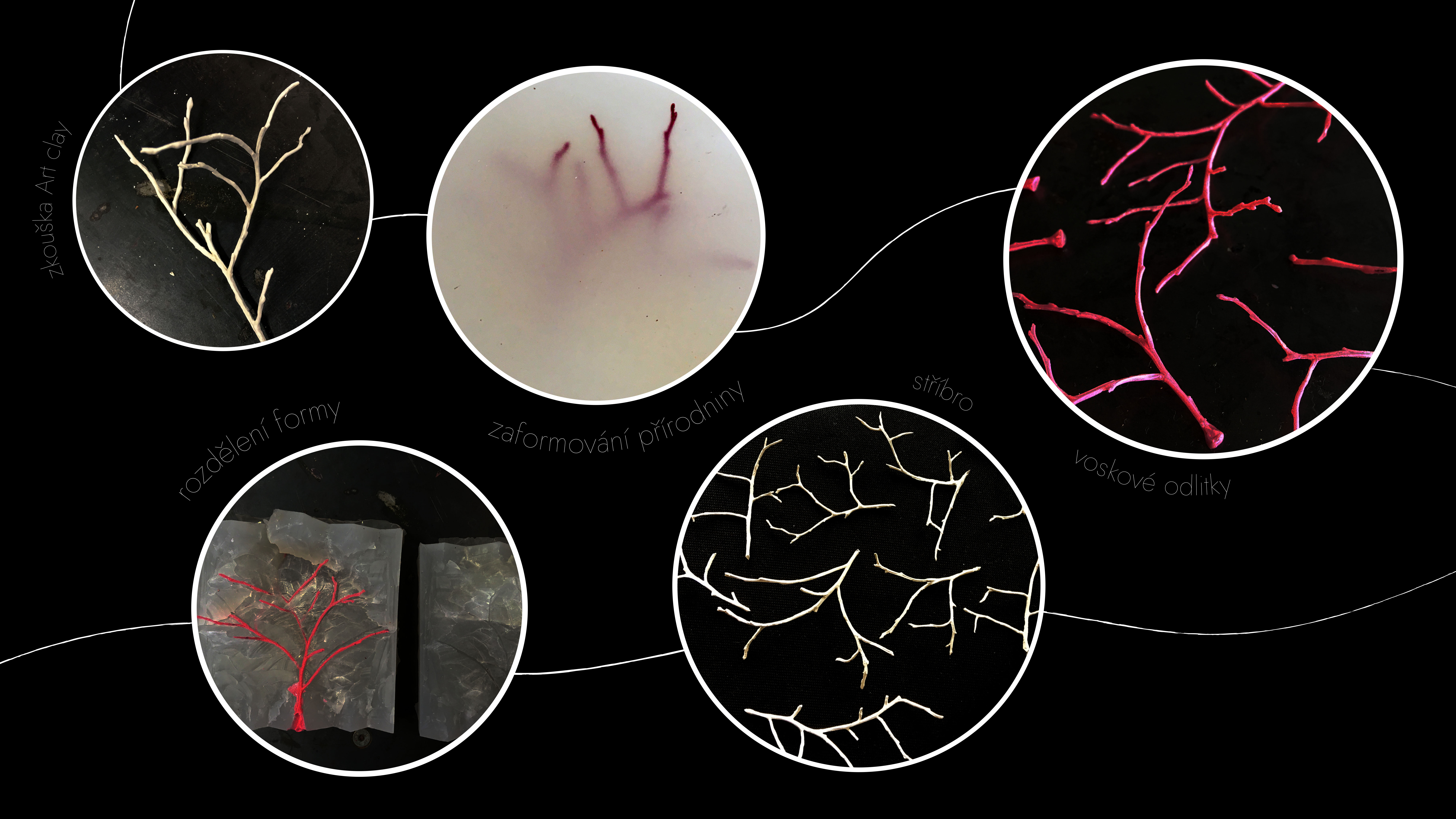 Materiálová zkouška k bakalářké práci obsahující zaformování borůvčí pomocí Art claye, akrylové barvy, laku na nehty nebo včelím voskem. Využití zafixování akrylovou barvou, následné zaformování do silikonu. Vytvrdnutí a rozdělení formy na dvě části a vstřikování vosku. Vznikají voskové odlitky, které byly odeslány do firmy. Tyto odlitky se přetváří na stříbrný surový šperk, který je potřeba dále opracovat.