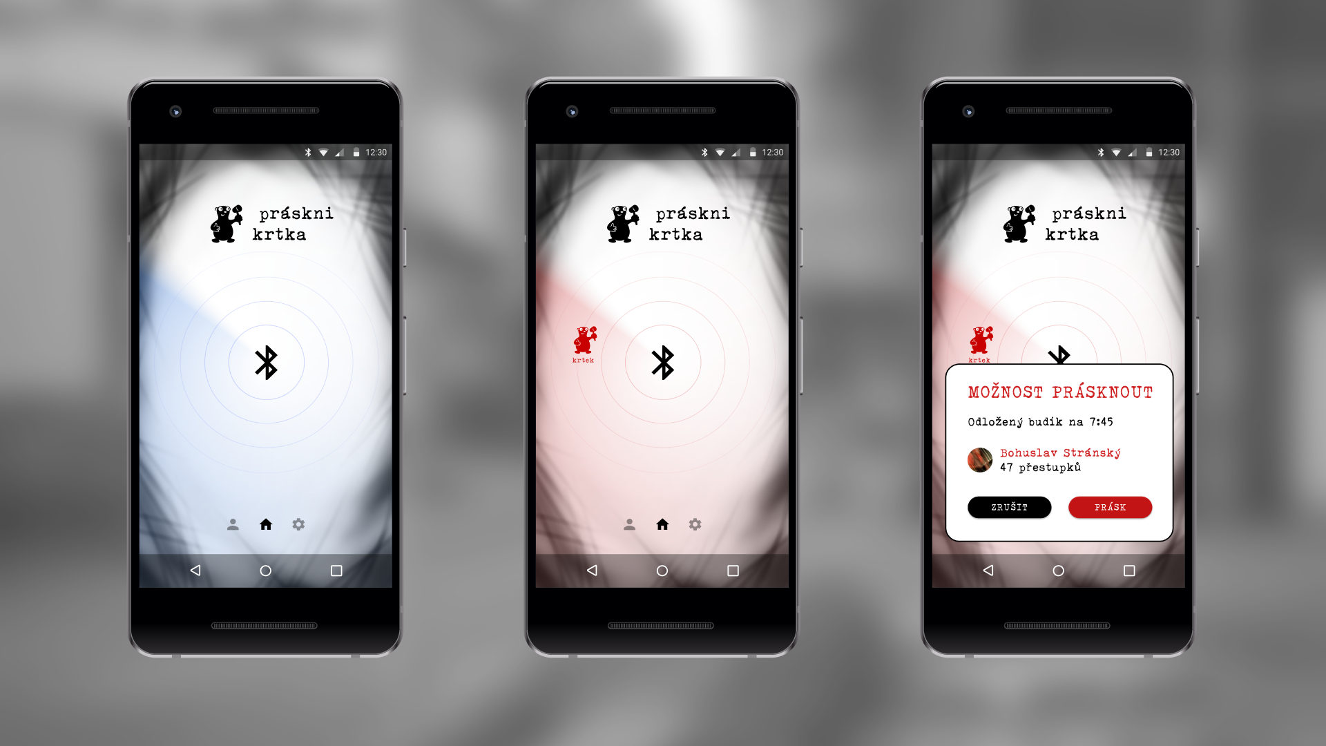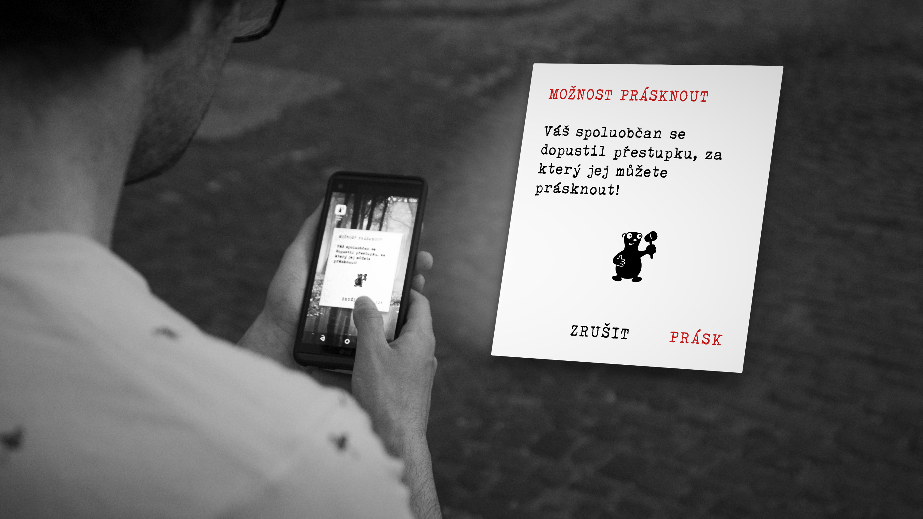 Koncept aplikace, která simuluje pocity strachu a nejistoty za éry komunismu. Soustředil jsem se konkrétně na „práskačství“, tedy udávání spoluobčanů. Název aplikace „Práskni krtka“ je modifikací názvu dětské hry „Plácni krtka“, při které hráč plácá krtky gumovou palicí. Krtek je v mém pojetí ten, který podrývá a podkopává systém a ukrývá se. Nainstalovaná aplikace si pamatuje, jakým způsobem používám telefon a vyhodnocuje „přestupky“. Tím může být např. odložený ranní budík. Pokud tedy ráno vstanu později, poté jdu do města a cestou potkám na ulici někoho s touto aplikací, proběhne anonymní předání informace o přestupku (pouze když se přiblížíme na dosah bluetooth) a dotyčný mě pak bude moci prásknout, protože mu přijde upozornění o mém přestupku. Já ale nevím, kdo mě práskl, a o svém přestupku se dozvím až zpětně. Ale co všechno aplikace vlastně sleduje? Kdo z těch lidí na ulici má aplikaci? Kdo o mně co ví? Mohu věřit vůbec někomu? Práce našla své místo na podzimní výstavě k 30. výročí Sametové revoluce.