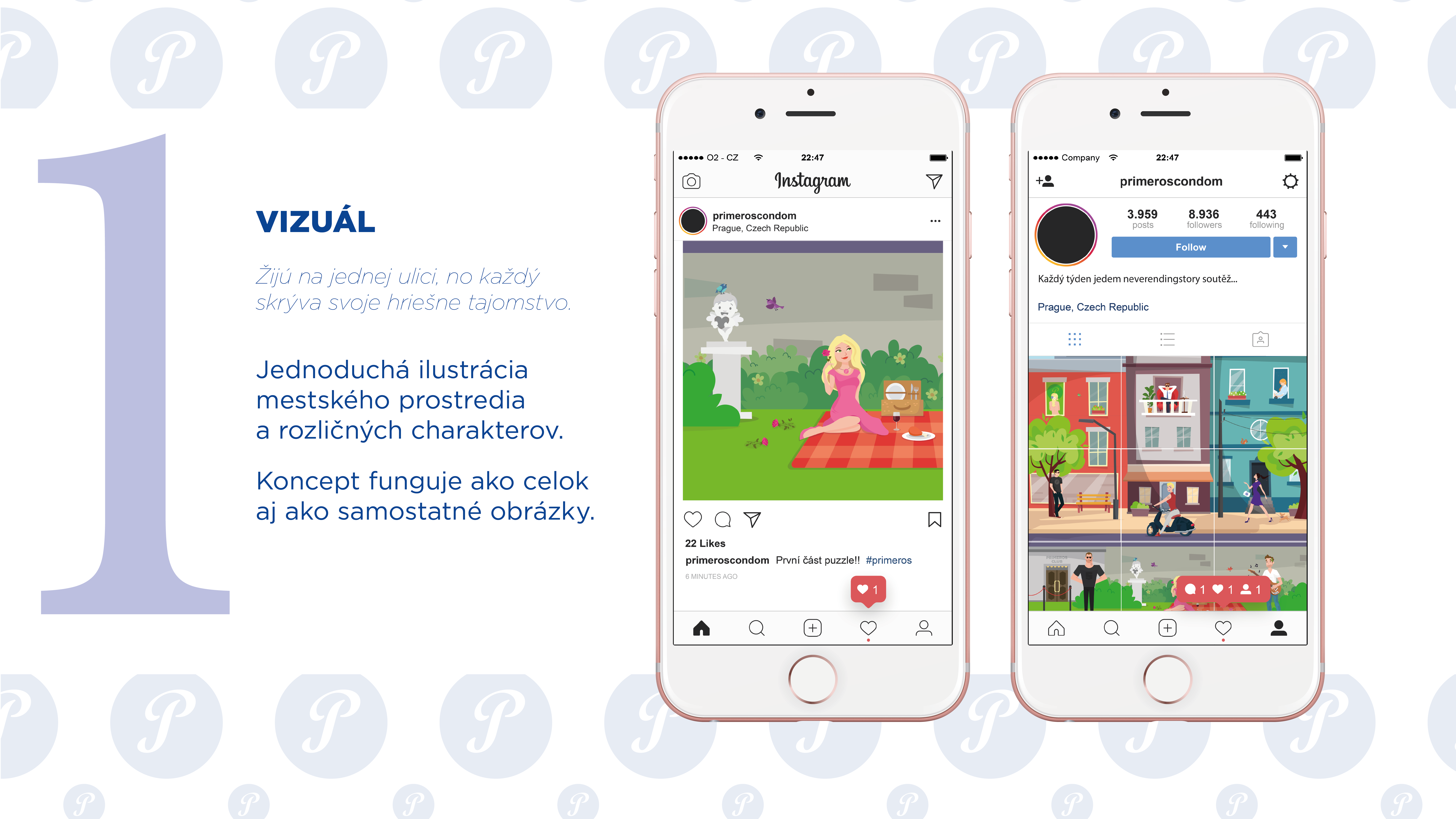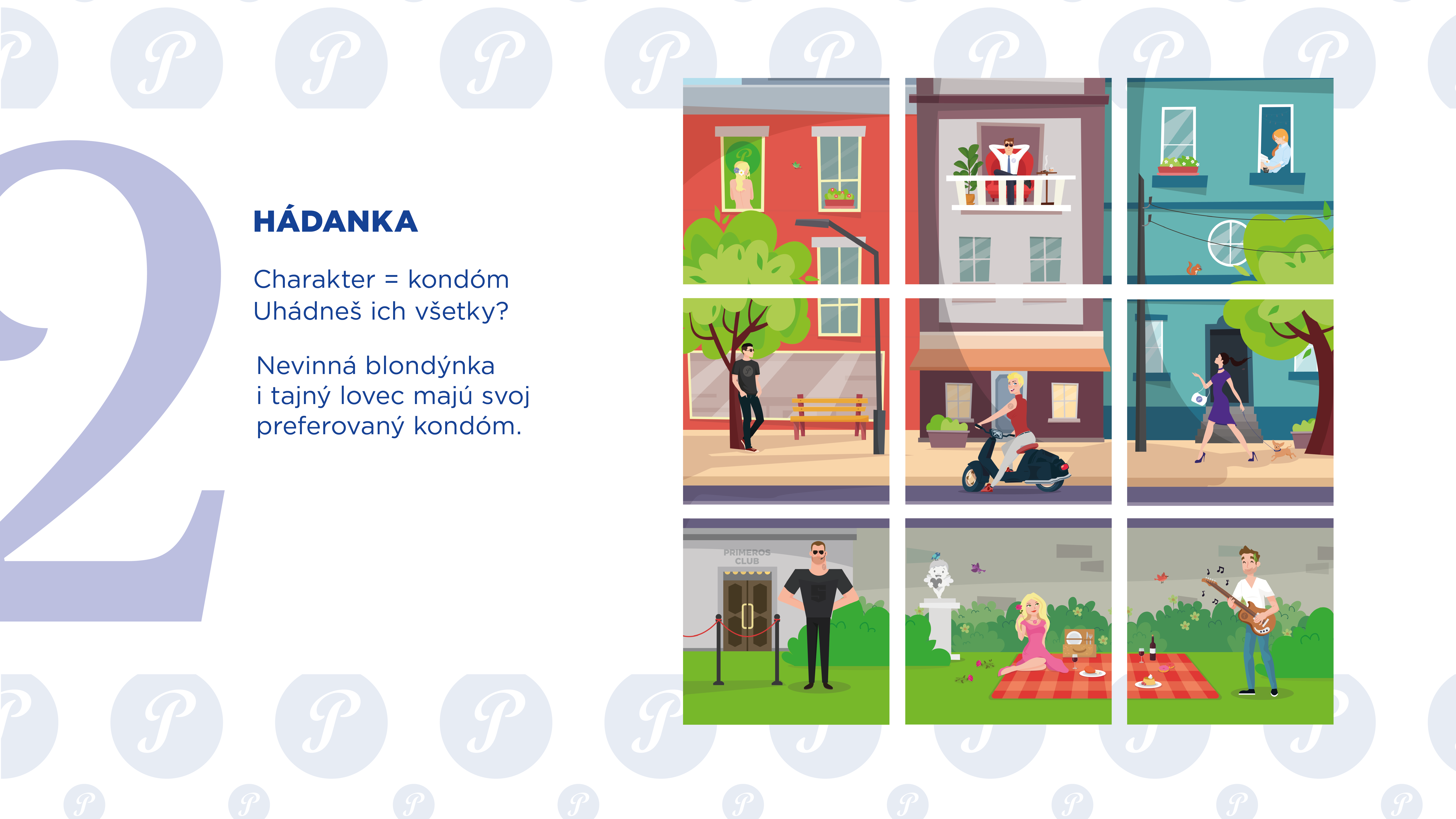 Design instagramovej súťažnej kampane Sex Positive pre firmu Primeros (výrobca a predajca kondómov Primeros) . Ilustrácia jednej ulice a 9 ľudí - každý skrýva svoje hriešne tajomstvo. Jeden človek predstavuje jeden kondóm. Uhádneš ktorý?