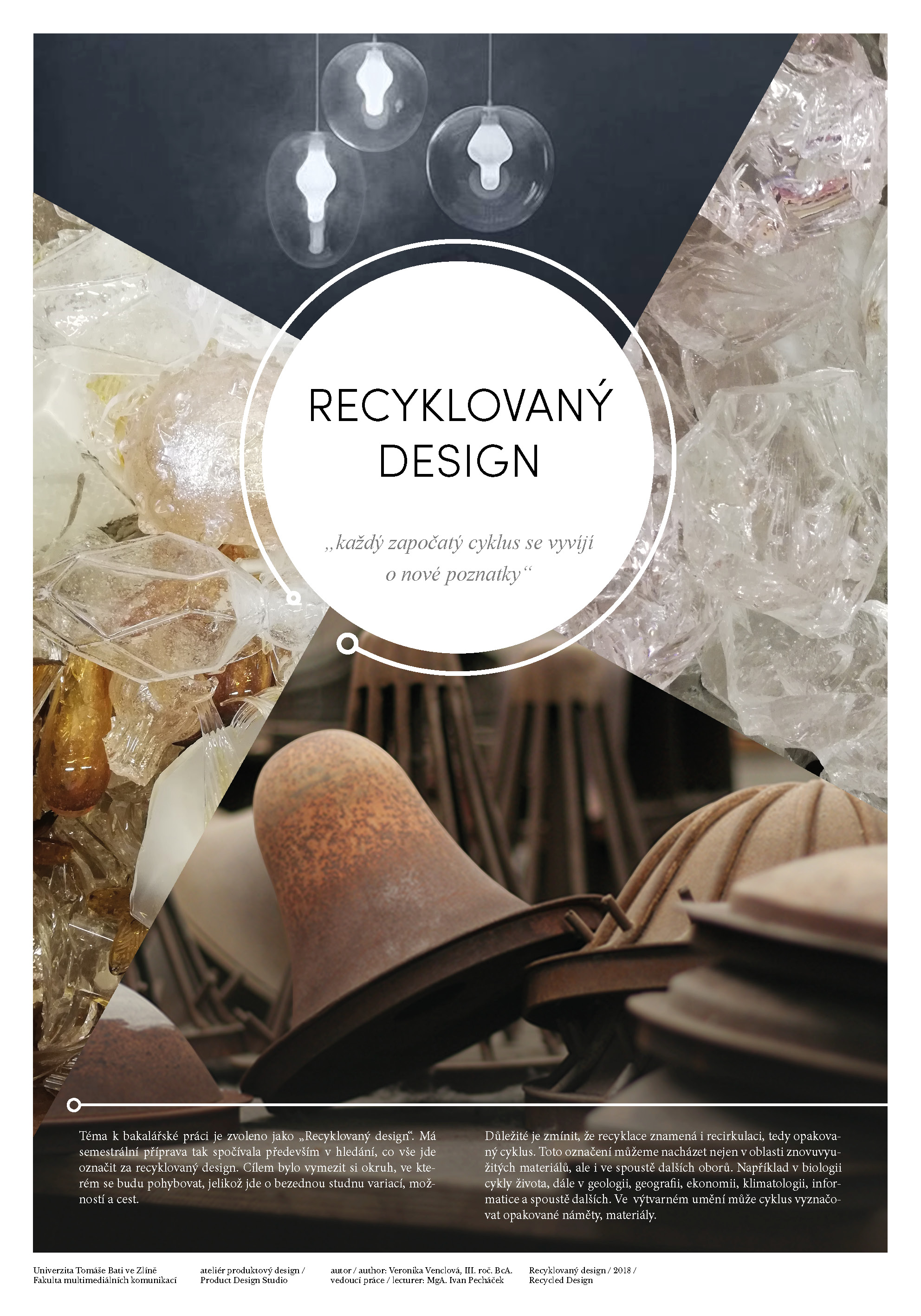 Téma k bakalářské práci je zvoleno jako „Recyklovaný design“. Má semestrální příprava tak spočívala především v hledání, co vše jde označit za recyklovaný design. Cílem bylo vymezit si okruh, ve kterém se budu pohybovat, jelikož jde o bezednou studnu variací, možností a cest.