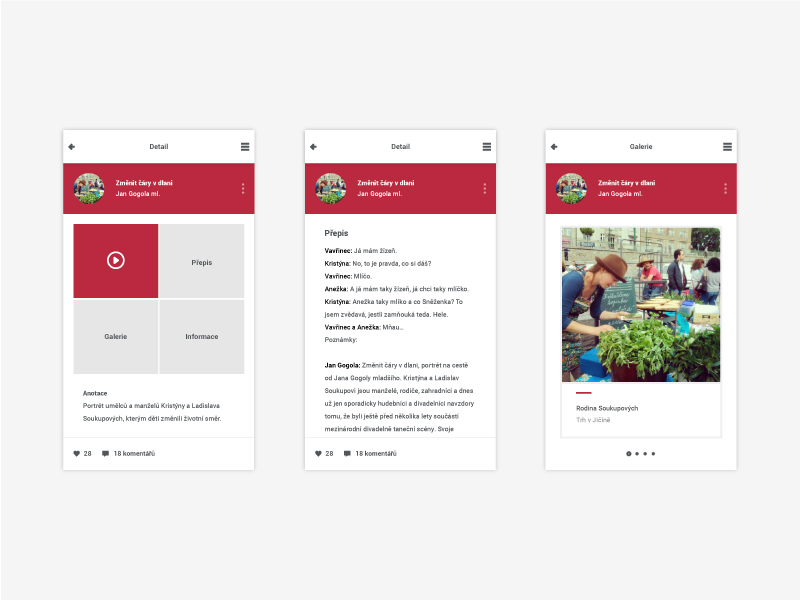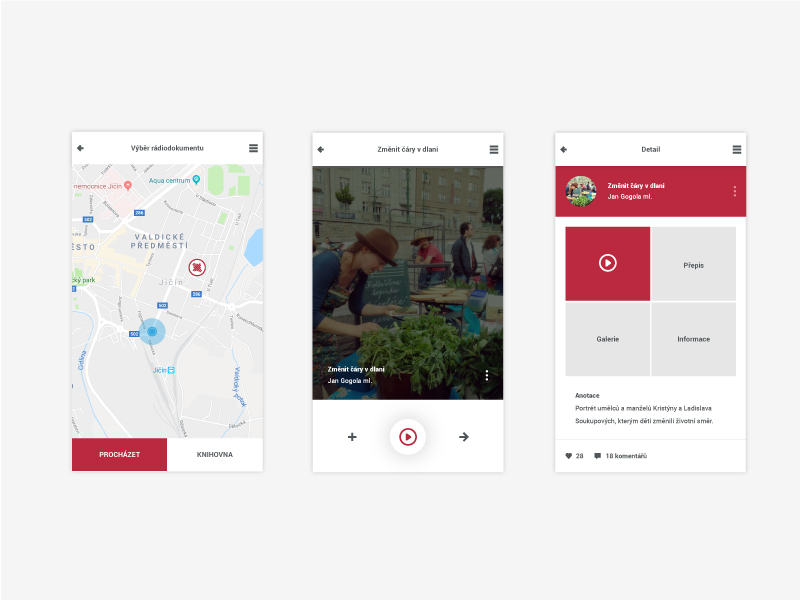 Detail rádiodokumentu - člověk je v Jičíně a může si tu pustit rádiodokument, který souvisí s tímto místem. Může se tak lépe vcítit do poslouchaného děje. Obohatí mu to jeho zážitek z poslechu. V detailu také můžeme pohodlně zobrazit přepis, shlédnout galerii zjistit více informací nebo si uložit dokument do knihovny pro pozdější poslech.