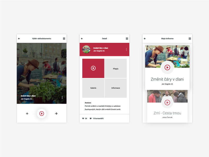 Koncept mobilní aplikace jsem se snažil navrhnout jednoduchou na ovládání, pohododlné pro uživatele. Barevnost vychází z webu Českého rozhlasu. Logo taktéž navazuje na vizuální styl Českého rozhlasu.