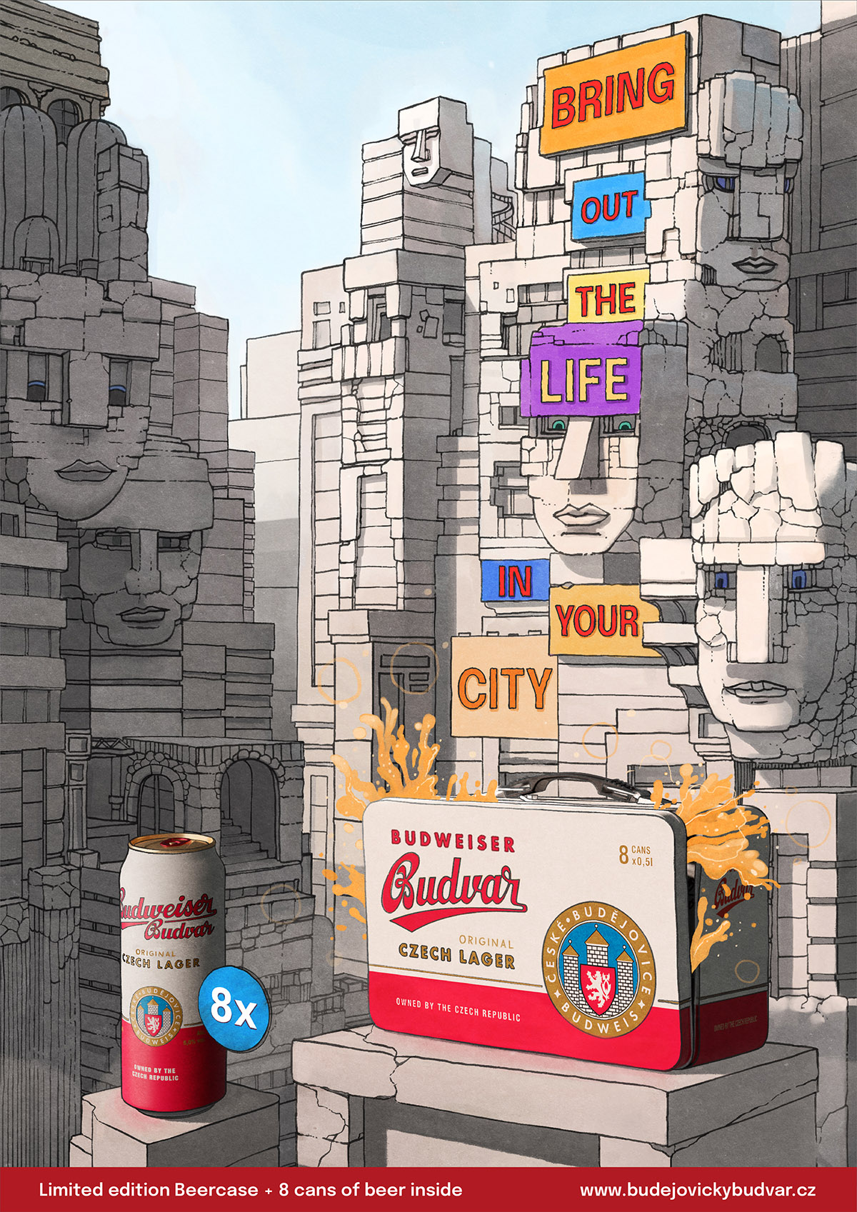 Reklamní plakát pro Budweiser Budvar. Pointou plakátu je naznačit kauzální vztah mezi pitím piva a pocitem štěstí/dobré nálady. Mám rád ilustraci tak ji cpu všude, but hey, it ain't honest but it's work.