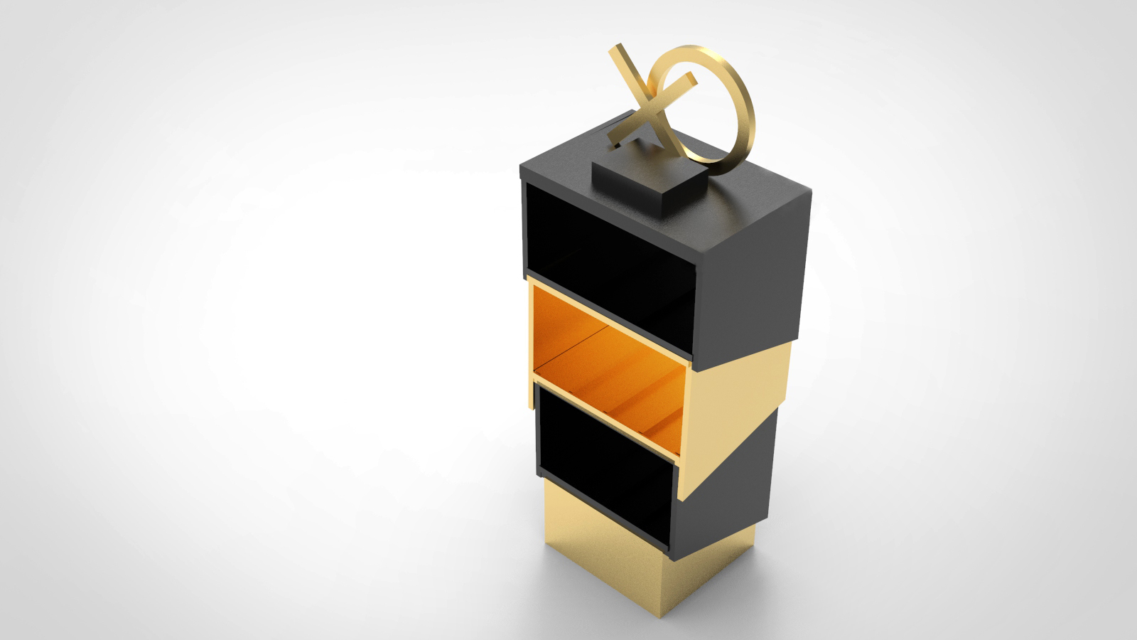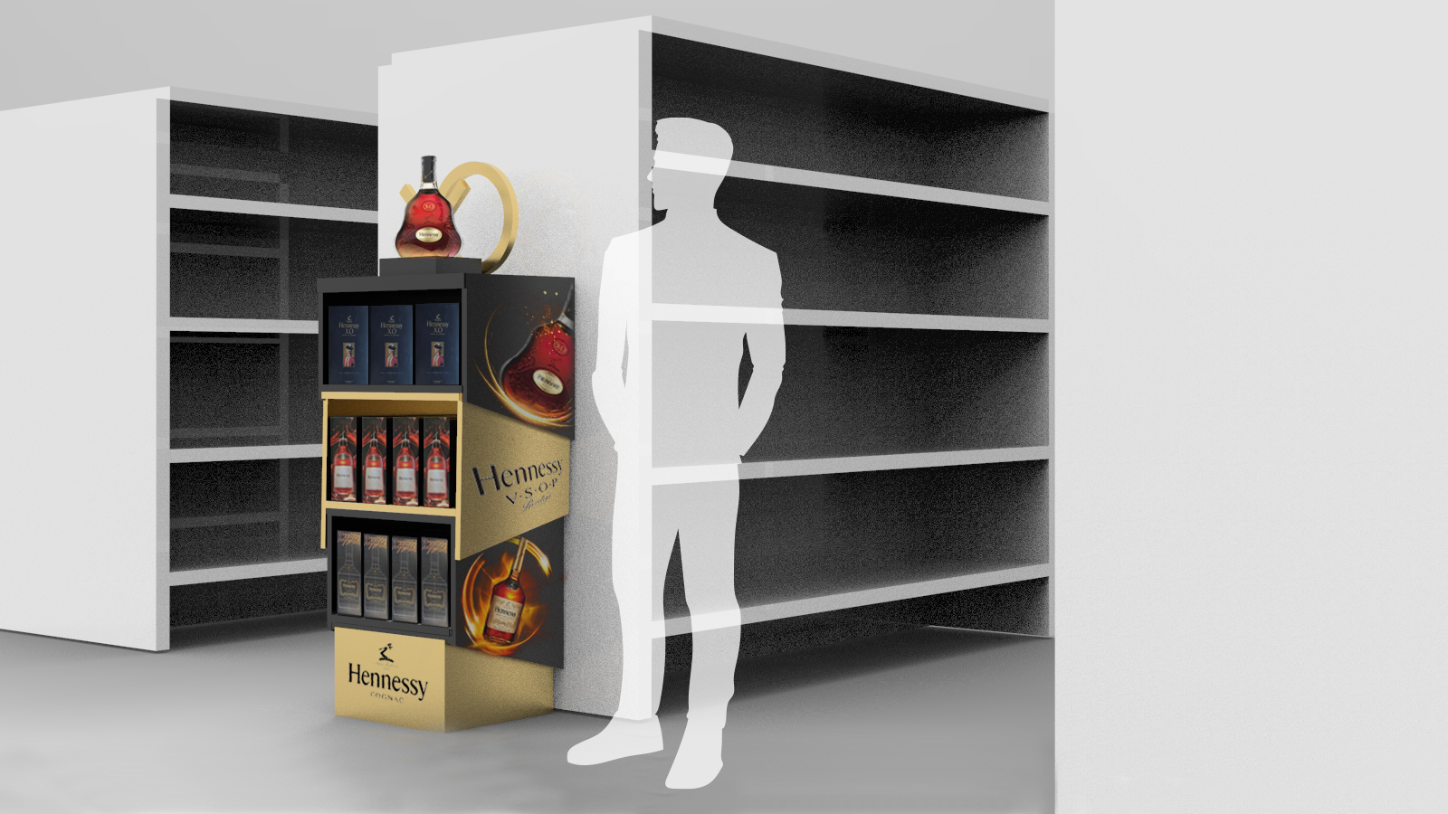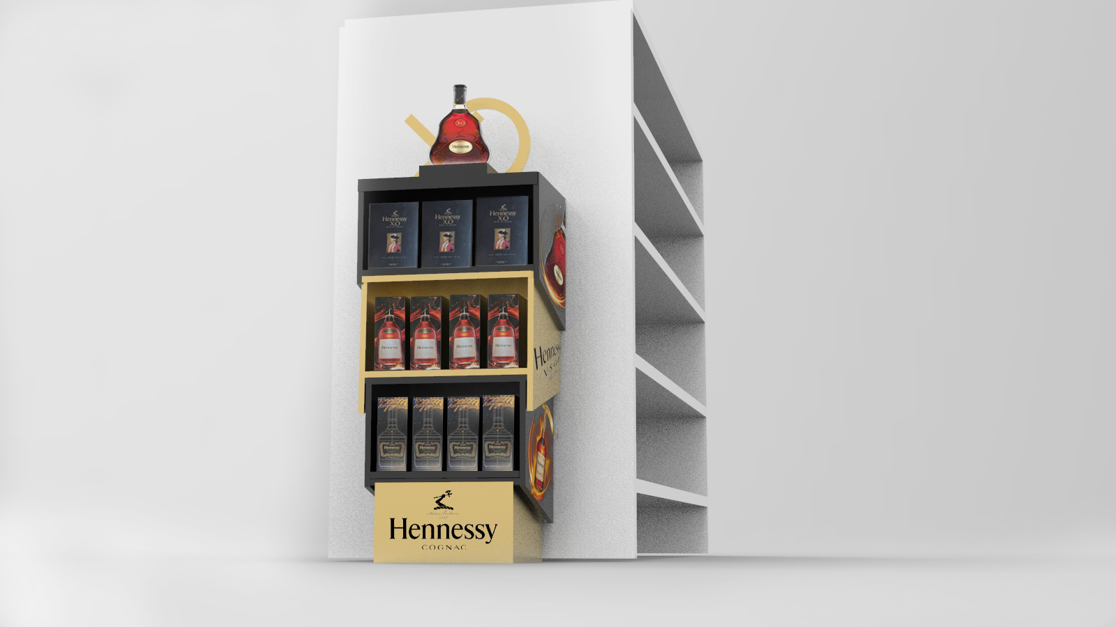 Stupňovitý stojan, který krom zlatočerné barevnosti přitáhne pozornost i topperem, který dělá korunu vystavené maketě lahve Hennessy X.O.