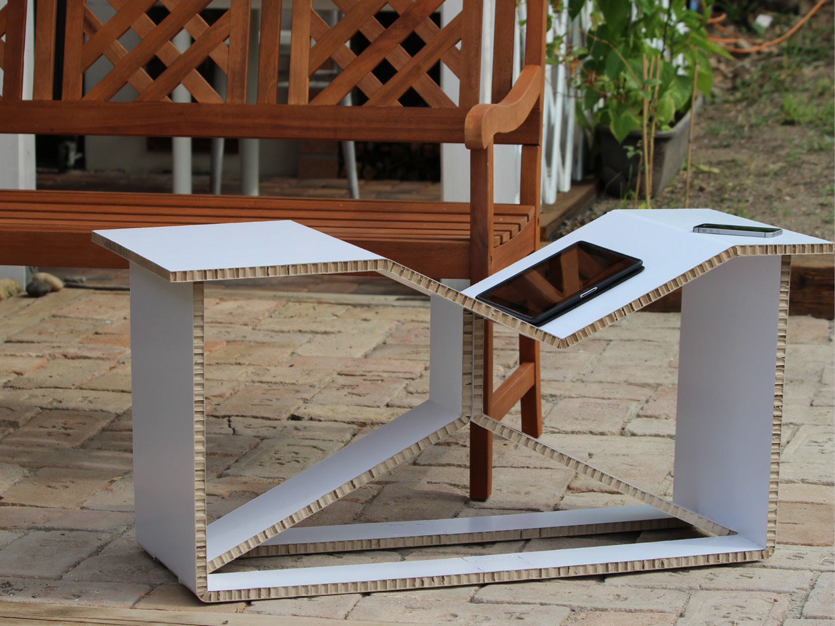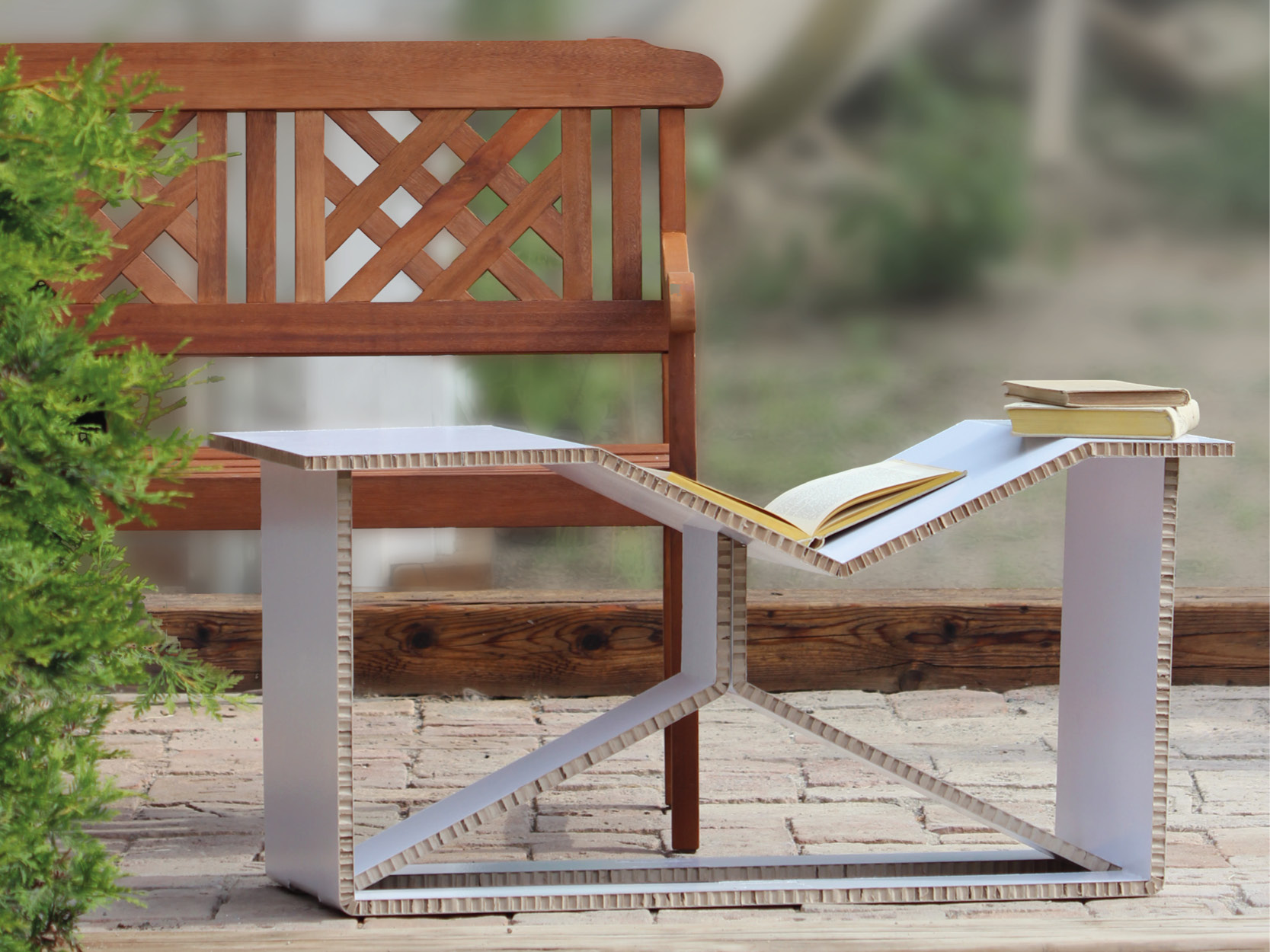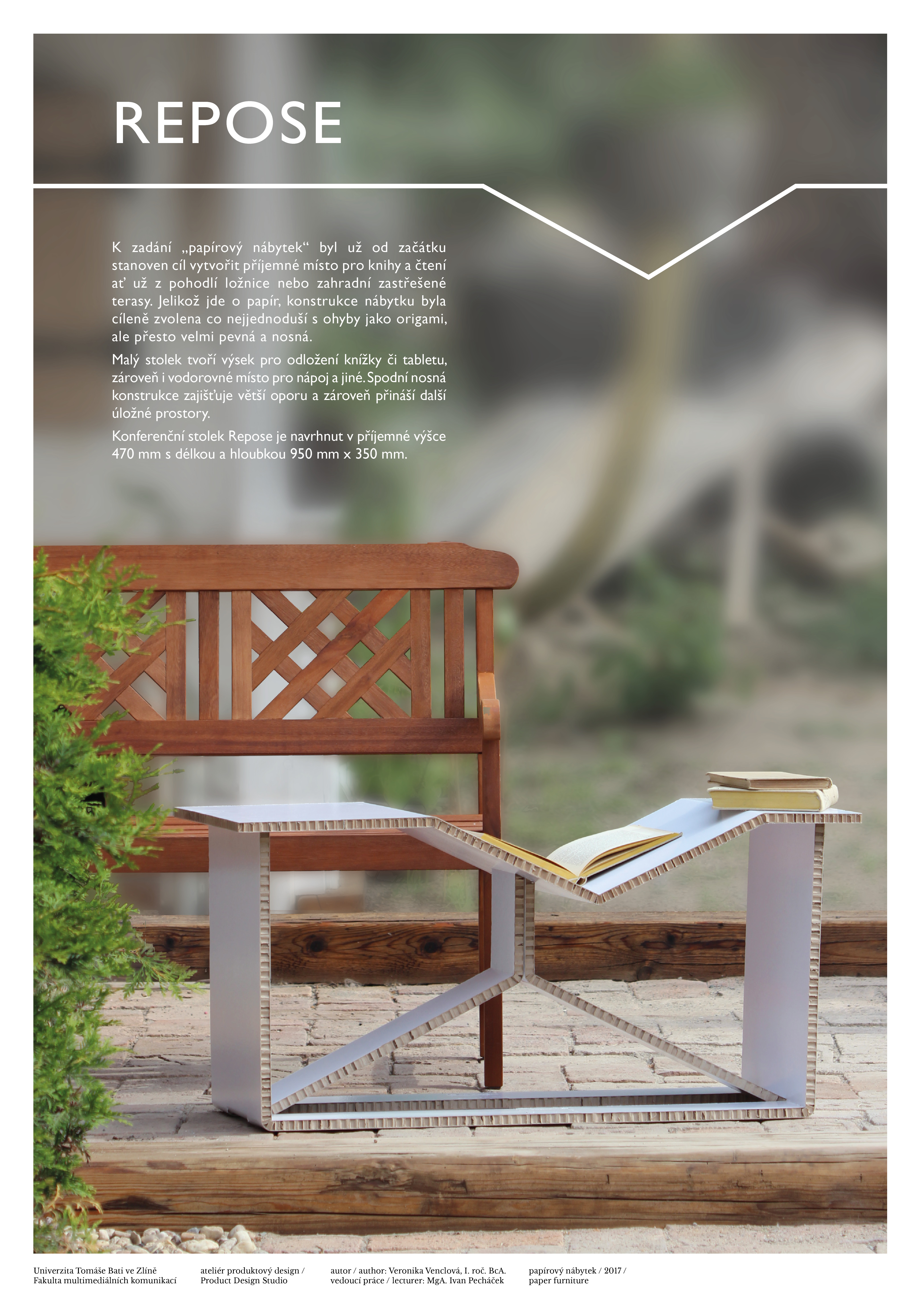 Konferenční papírový stolek je inspirovaný papírovými vlaštovkami. Cílem bylo vytvořit místo pro pohodlné čtení. Stolek tvoří výsek pro odložení knížky či tabletu, zároveň i vodorovné místo pro nápoj a jiné. Spodní nosná konstrukce zajišťuje větší oporu a zároveň přináší další úložné prostory.