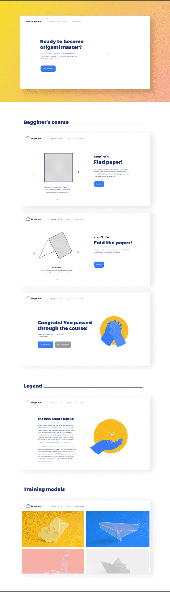 Origa.me je výukový web určený primárně pro začátečníky ve skládání origami. Nabízí výukový kurz o čtyřech krocích, které uživatele seznámí se základy skládání, materiály a jak číst postupy. Své dovednosti pak může zlepšovat na několika tréninkových modelech, seřazených podle obtížnosti. Pro lepší pochopení a upoutání pozornosti je web doplněn několika animacemi.