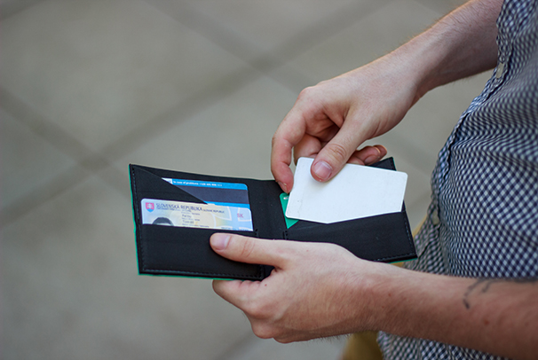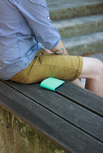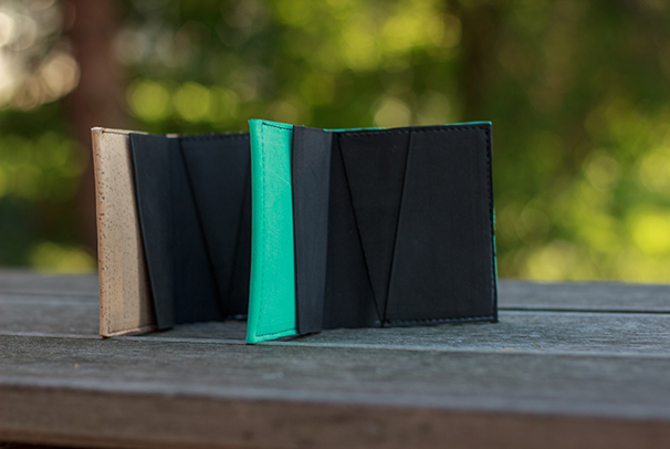 Materiálom je EVAC, ktorý zvláda namáhanie a bežné používanie, v podobe peňaženiek sa nevyskytuje. Snažím sa využiť jeho vlastnosti, ktoré ma podnecovali k zlepšovaniu produktu. K materiálu sa dostávam ako k odpadovému, čiže pozadie výroby má čiastočne eokologického ducha.