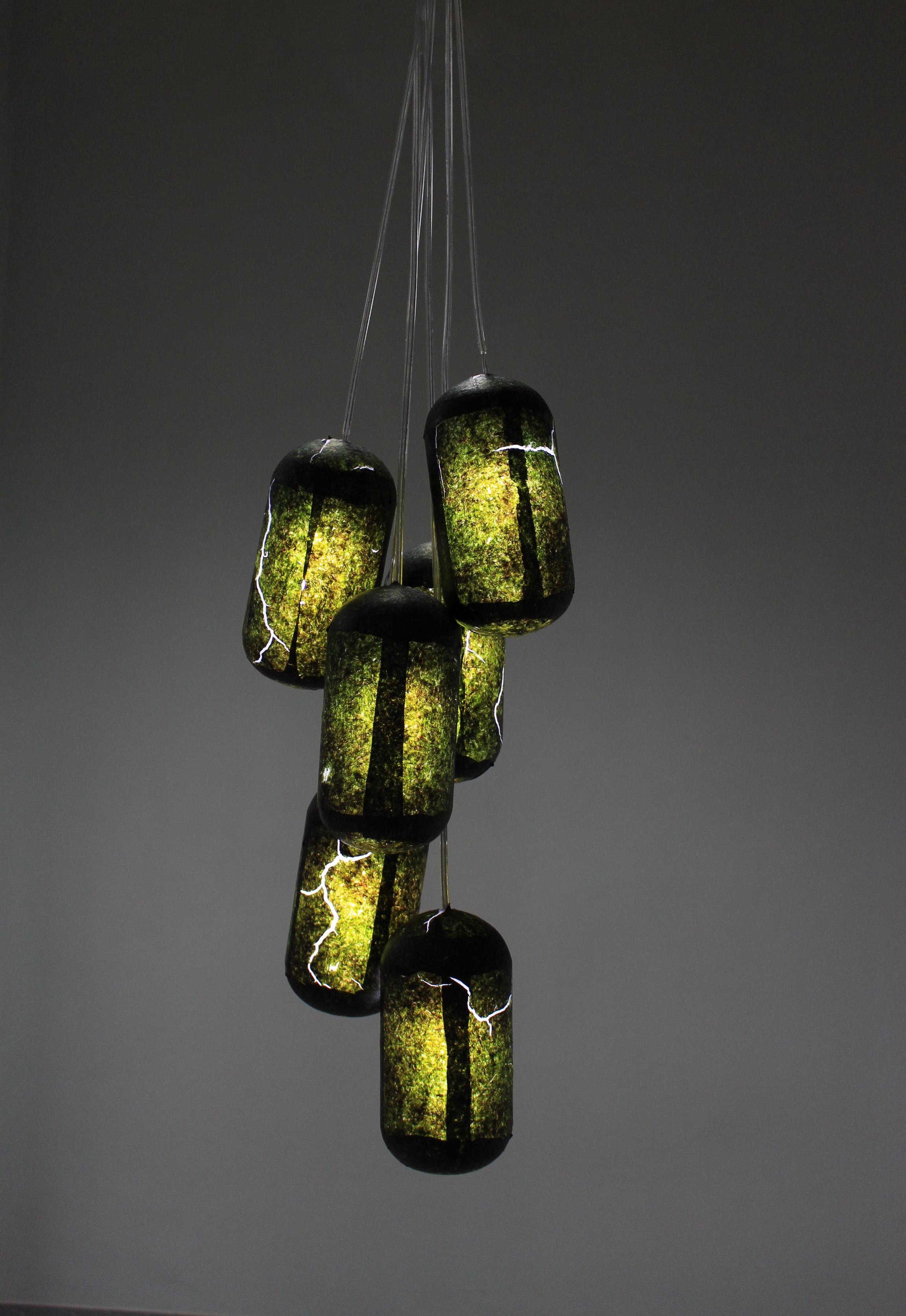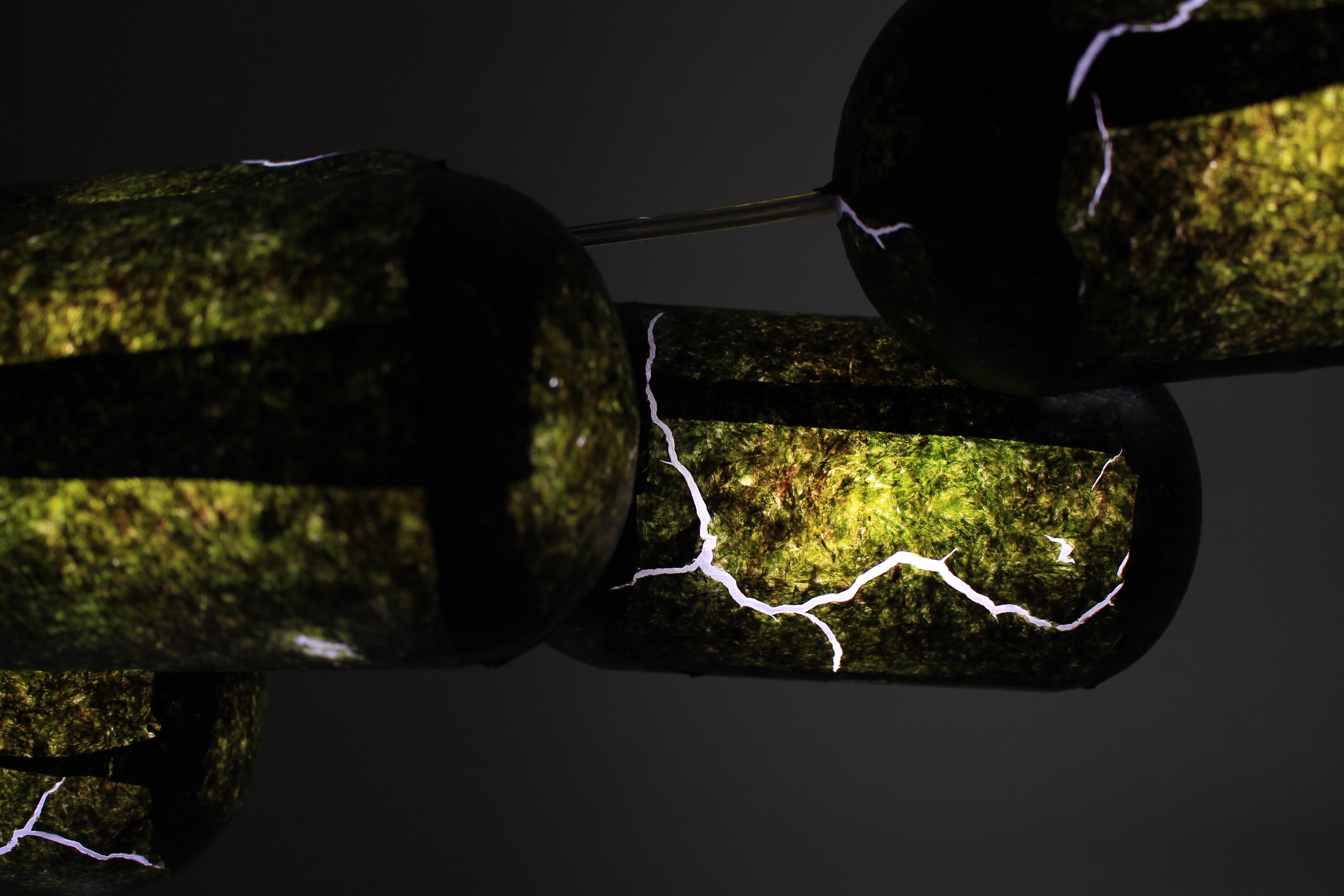 Ambientní svítidlo, které se skládá z 3D tiskových forem s nánosem plátů mořských řas. Řasy jsem nechala přirozeně uschnout a neovlivňovala jejich narušení povrchu. Praskliny propouští více světla a doplňují texturu.