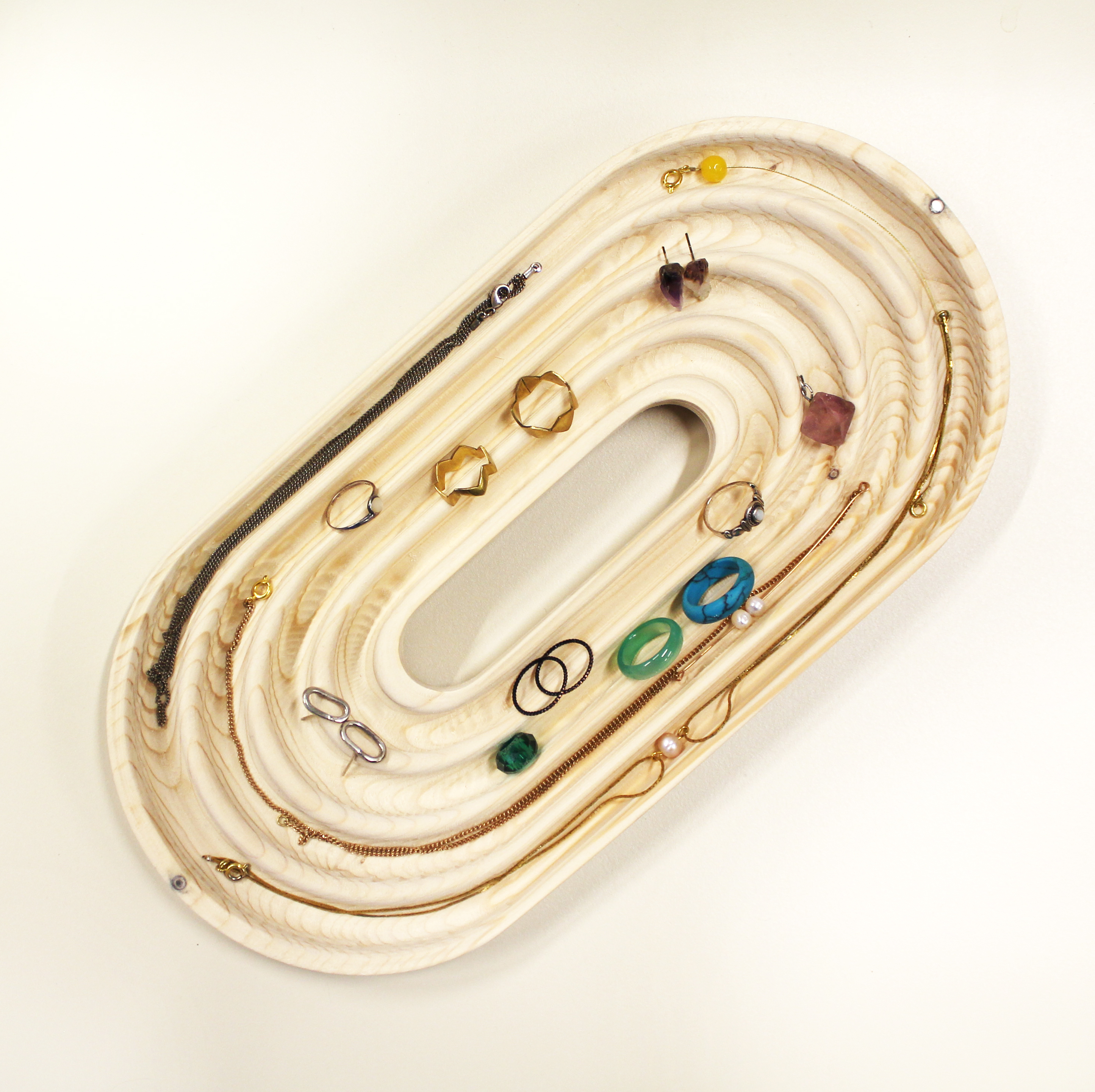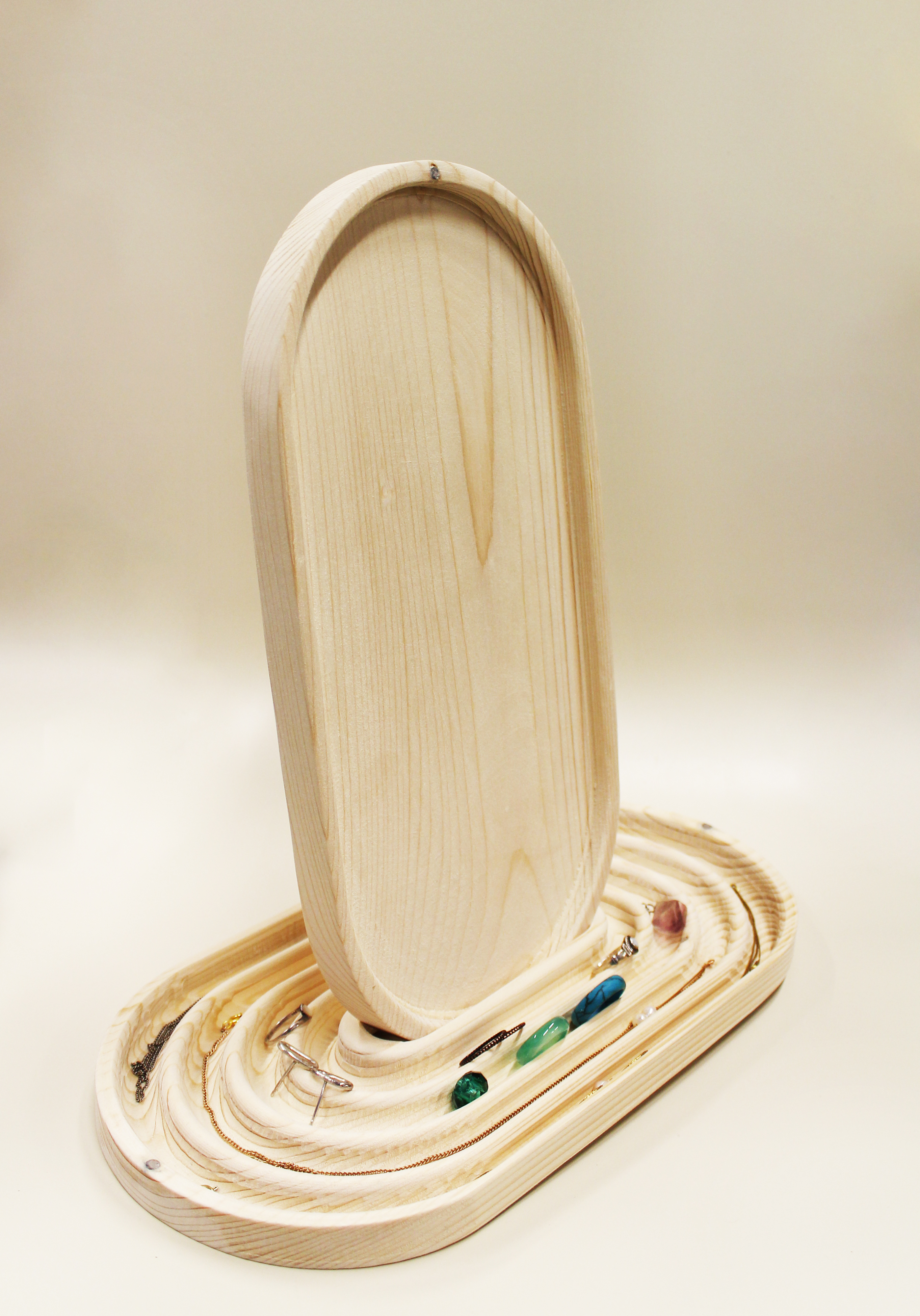 Šperkovnica vznikla pomocou techniky frézovania do dreva a skladá sa z dvoch častí. Spodná časť sa podobá na pretekársku dráhu, na ktorej vznikajú vlny, ktoré vytvárajú priestor pre šperky. Náhrdelníky a retiazky sa dajú uložiť pozdĺž celej dĺžky, prstene alebo náušnice je následne možné oprieť o vlnky. Spodná časť taktiež obsahuje otvor uprostred šperkovnice, do ktorého zapadá druhá časť - vrchnák - doň je vsadené zrkadlo. Obe časti sú spojené magnetmi.