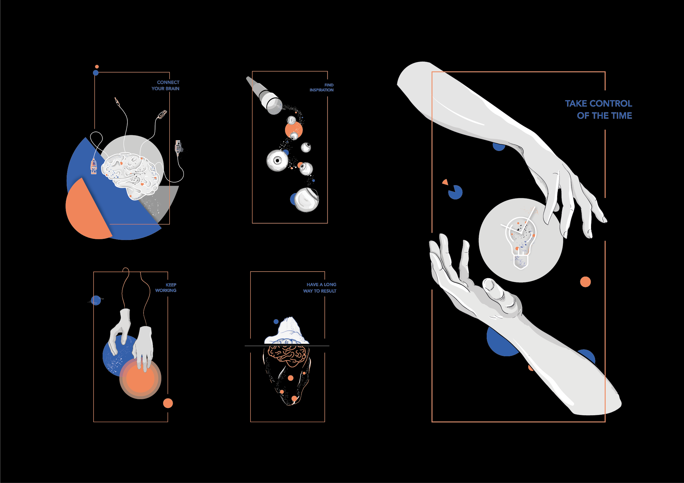 Pro tvorbu autorských motivů pro ateliér digitálního designu jsem se inspirovala vě věcech, které nás jako tvůrce potkávají. Pět kompozic tvoří čas, inspiraci, spolupráci a vývoj.