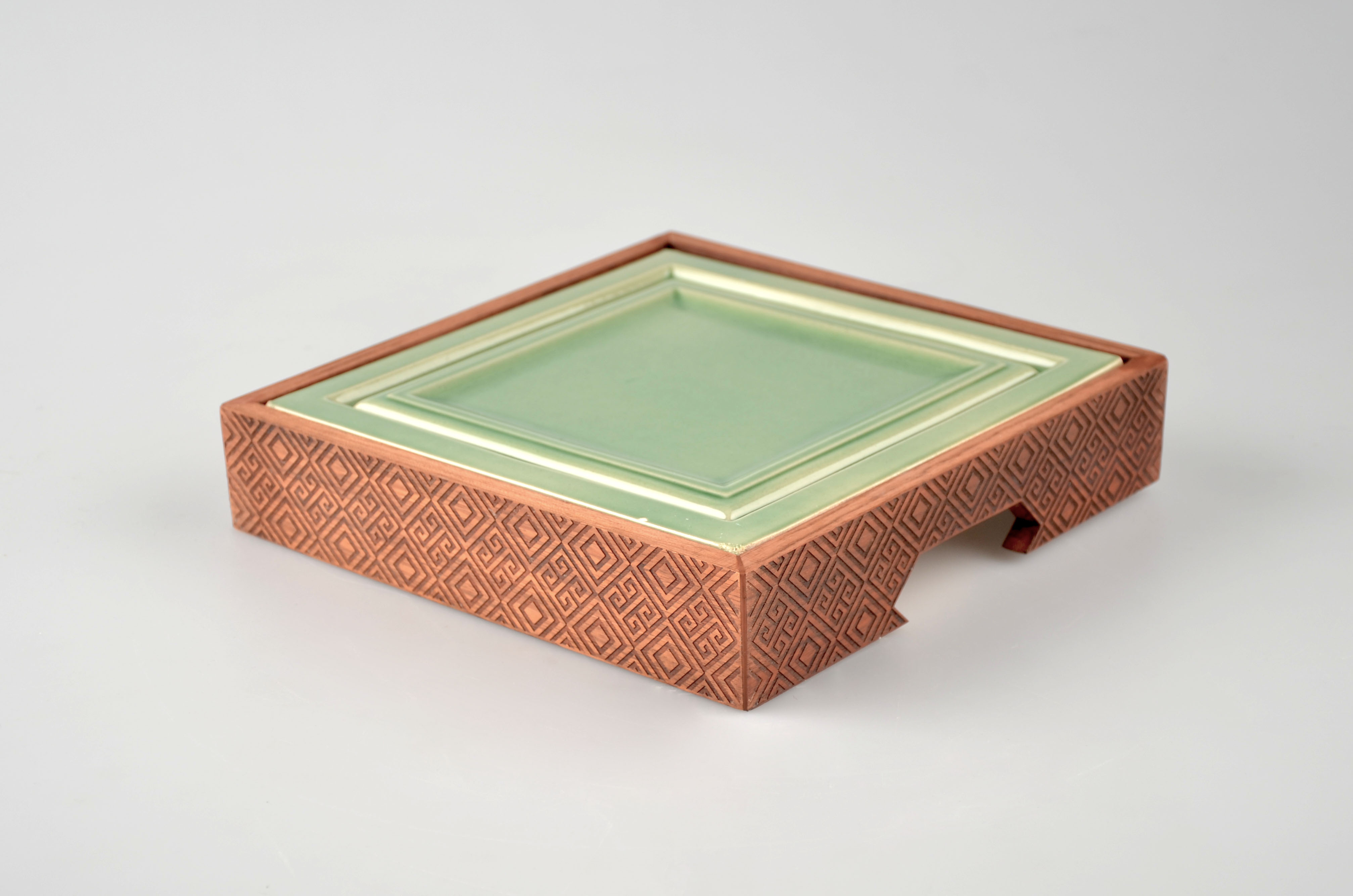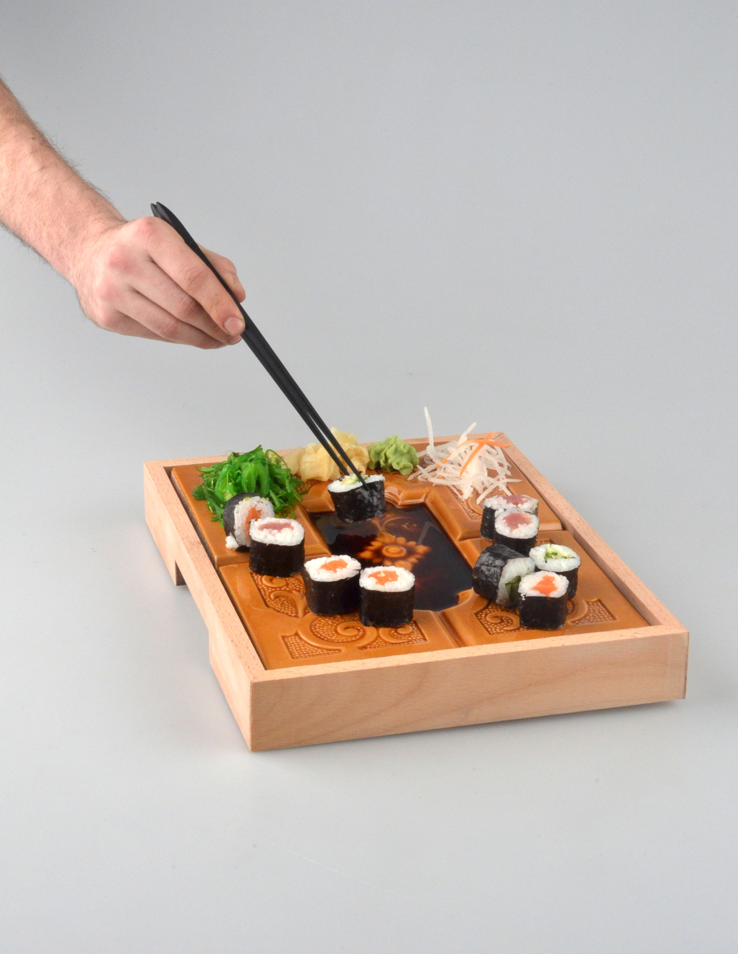 Odpadní materiál jsou keramické kachle, které mi zprostředkovala firma Vysočanka. Obohacuji je dřevěným, vyjímatelným rámečkem pro dobrou manipulaci a údržbu.