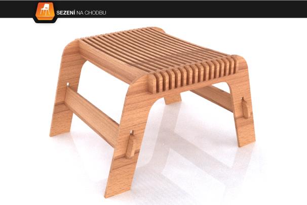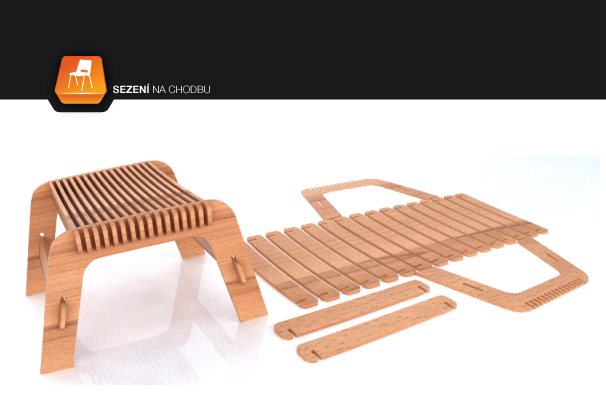 Jedná se o skládací lavici bez použití vrutů či lepidla. Překližková deska s hloubkou 1cm je vyřezána na přístroji Zund.