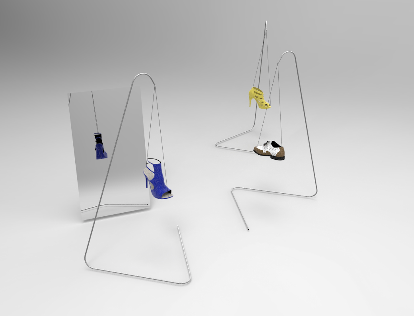 Celokovový stojan vyrobený z jednoho kusu vyváženého tak, aby unesl jeden kus obuvi. Jeho minimalistický design nechá vyniknout vystavovaný produkt, který je zavěšený v prostoru.