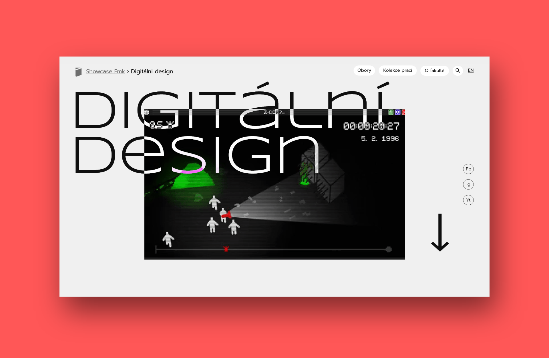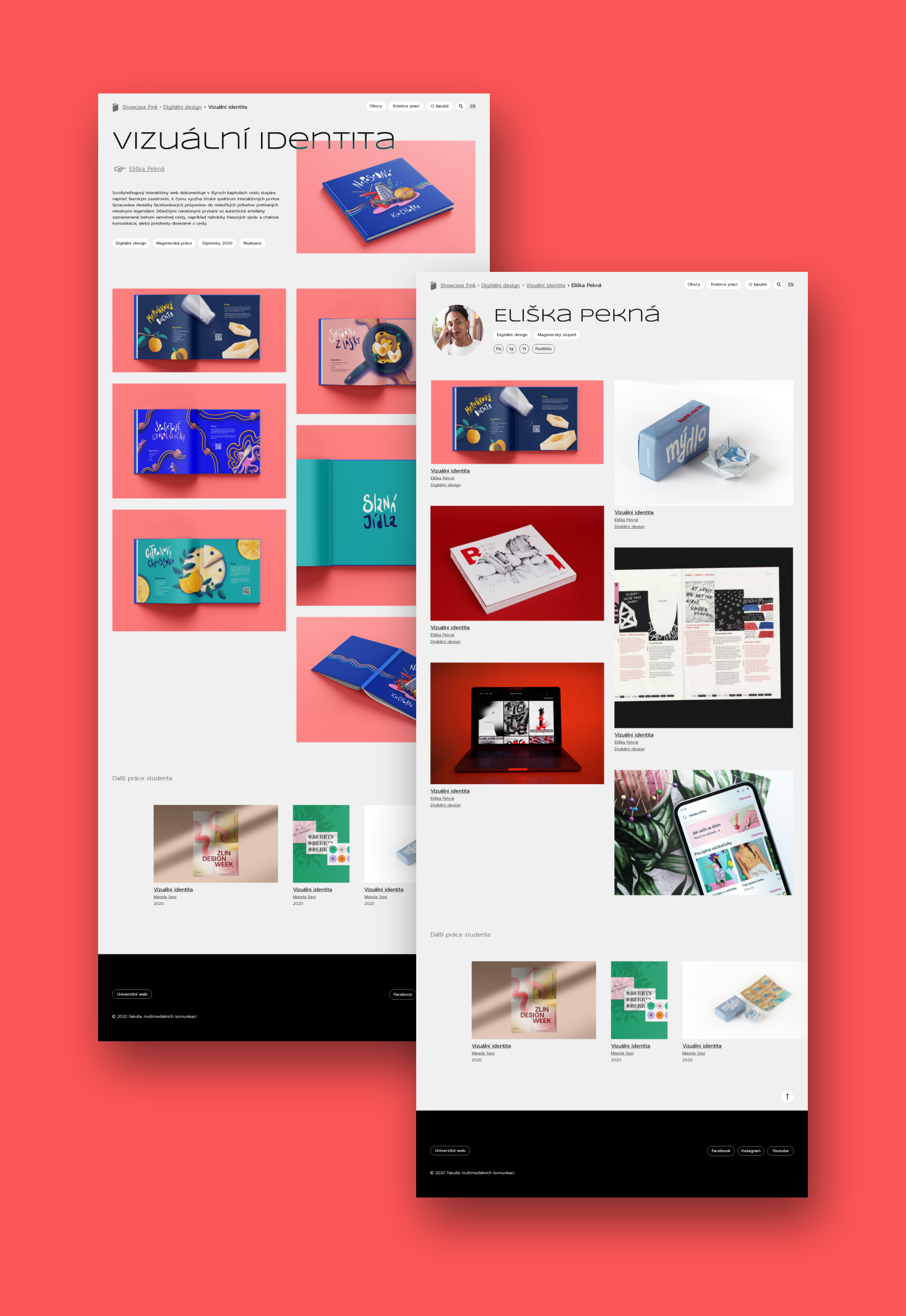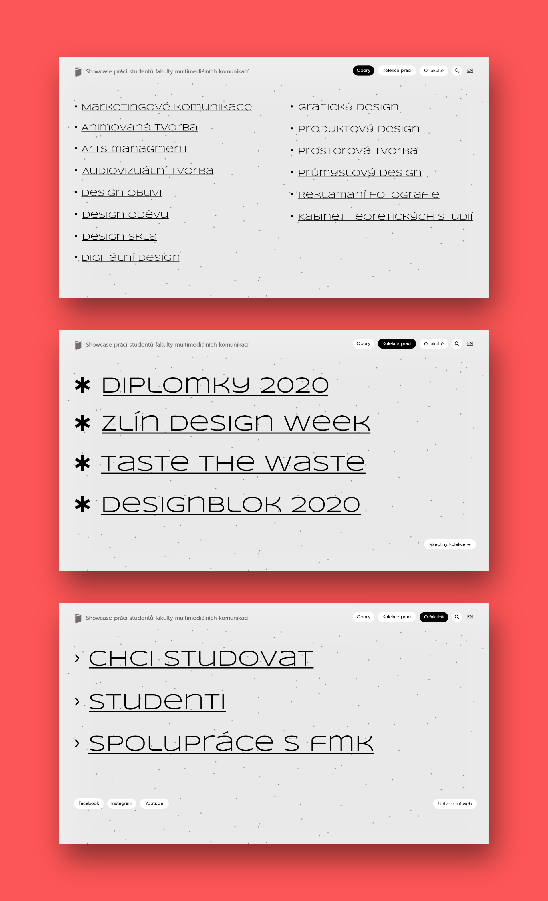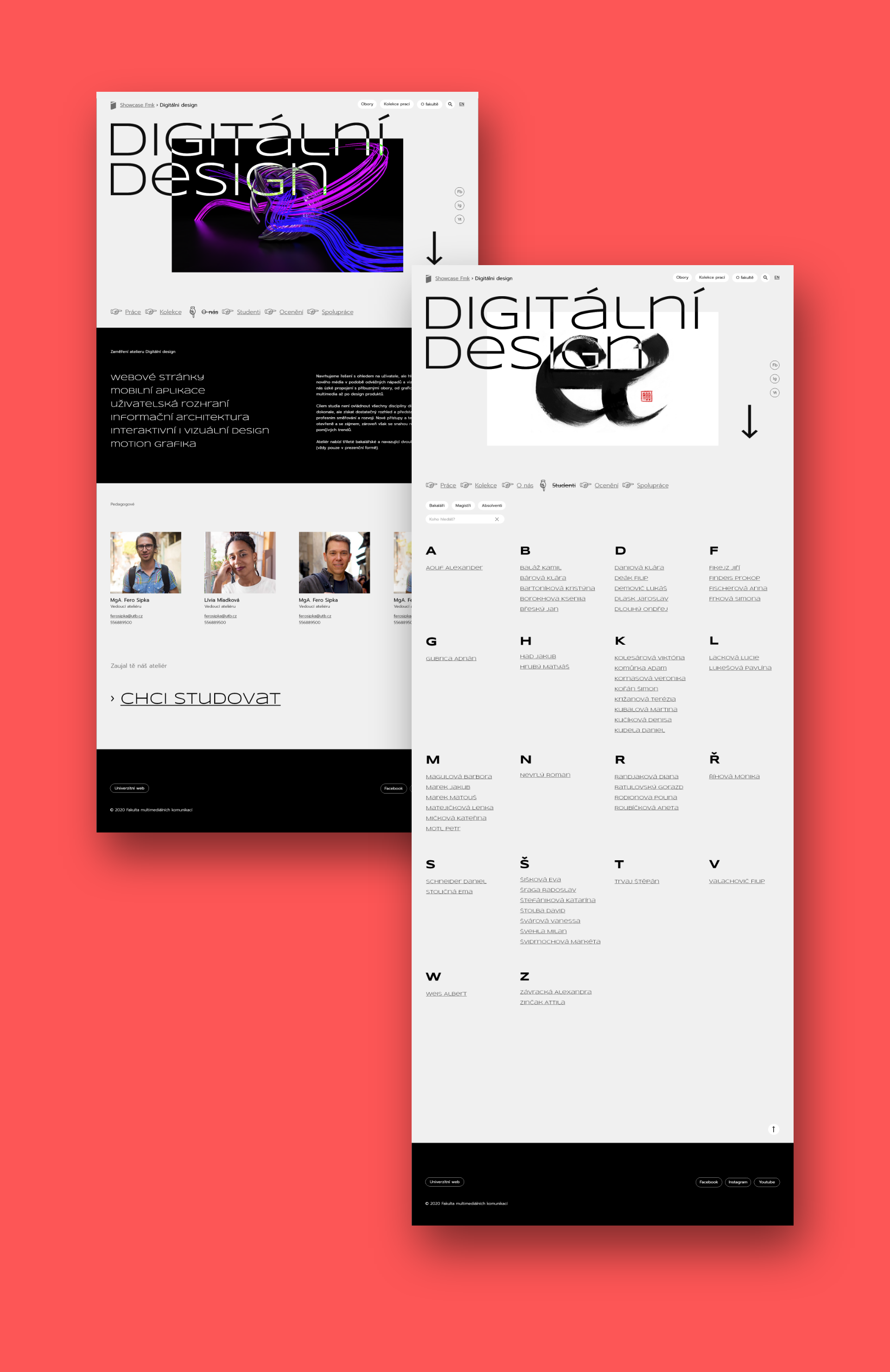 Zadaním bolo vytvoriť showcase prací študentov pre všetky ateliéry a ústavy fakulty multimediálnych komunikácií. V mojom návrhu kladiem dôraz na výraznú typografiu a prácu s typografickými symbolmi a znakmi na jednoduchom pozadí. Základom je práca s rôznymi formátmi obrázkov a filtrami, kde si môžeme navoliť viacero variant. Hlavným pútačom úvodnej stránky je náhľadový obrázok alebo video prác z vybranej kolekcie.