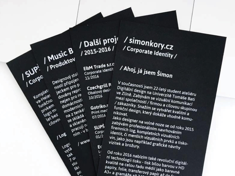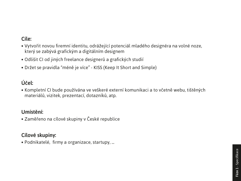 který se zabývá grafickým designem a tiskem bílou barvou. Odlišit CI od jiných freelance designerů a grafických studií. Držet se pravidla „méně je více” - KISS (Keep It Short and Simple). Účel: Kompletní CI bude používána ve veškeré externí komunikaci a to včetně webu, tištěných materiálů, vizitek, prezentací, dotazníků, atp. Umístění: Zaměřeno na cílové skupiny v České republice. Cílové skupiny: Podnikatelé, firmy a organizace, startupy,.. Sběr informací o prostředí viz. fotografie. Jedinečný prodejní argument, prvek odlišnosti: Funkční design, který dokáže vhodně komunikovat s cílovou skupinou. Smysl pro detail, individuální přístup, současný český i světový grafický design. Nabídka digitálního tisku, včetně tisku bílou barvou - technologie CMYW, řezaná grafika.
